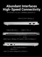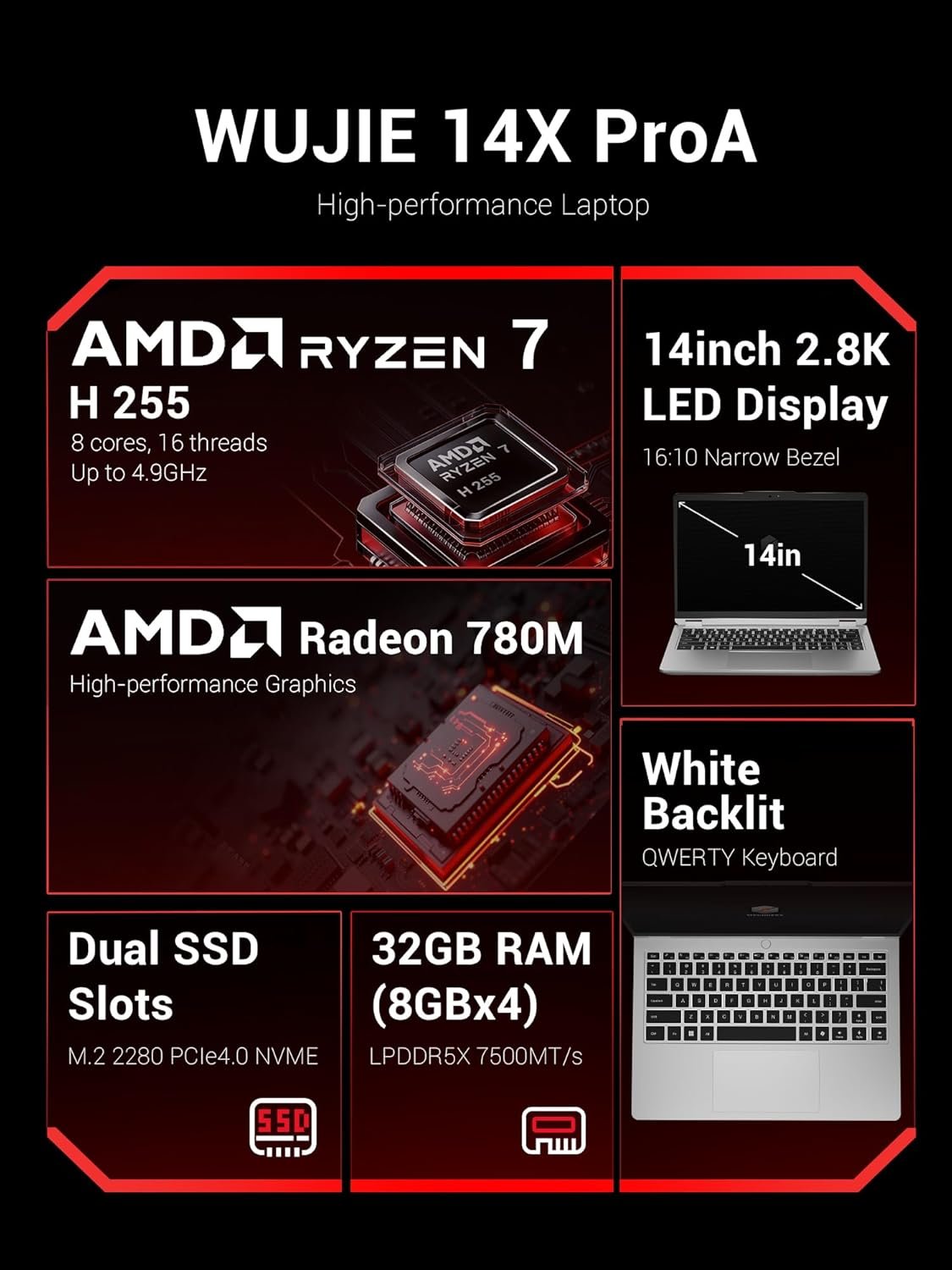 🔺【Massive Memory & Pro-Level Expandability】Stop worrying about storage limits or lag. FIREBAT laptop computer comes loaded with a massive 32GB LPDDR5X 7500MT/s RAM for seamless multitasking and a lightning-fast 1TB PCIe SSD. Need more? The dual M.2 2280 PCIe 4.0 slots allow you to expand your storage up to a staggering 8TB(4TBx2). It also features an advanced three-level adjustable white backlit QWERTY keyboard with a 0.05in/1.3mm key travel, providing fast key response and minimal finger movement for improved typing speed. It is designed for high-speed typing and extensive data management.