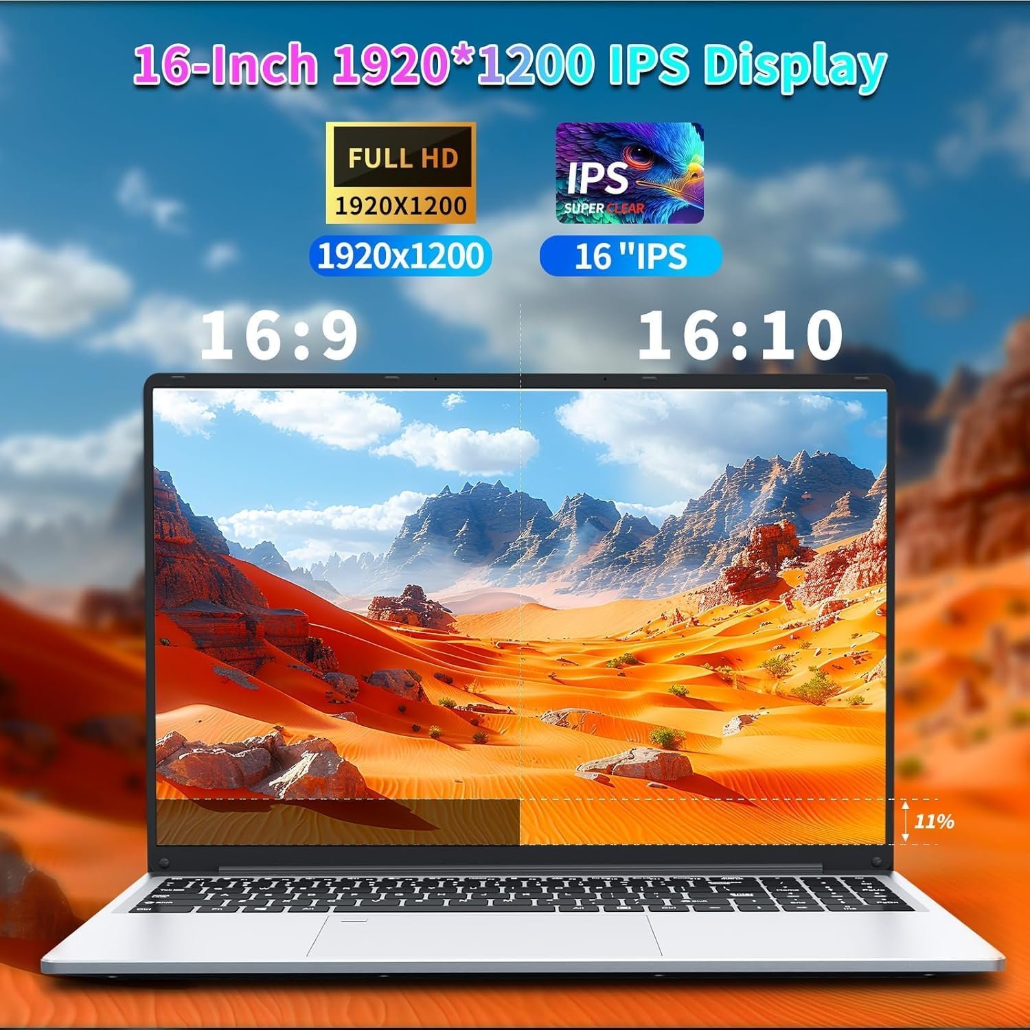 16-INCH FHD IPS SCREEN:The 16-inch laptops comes with a 16-inch FHD IPS screen with 1920×1200 pixels.The FHD screen and slightly narrow bezel design provide an immersive visual experience for graphic design or video editing,and also help reduce eye blemishes caused by long hours of work,thanks to its eye-friendly screen that provides excellent image quality and saves you from discomfort