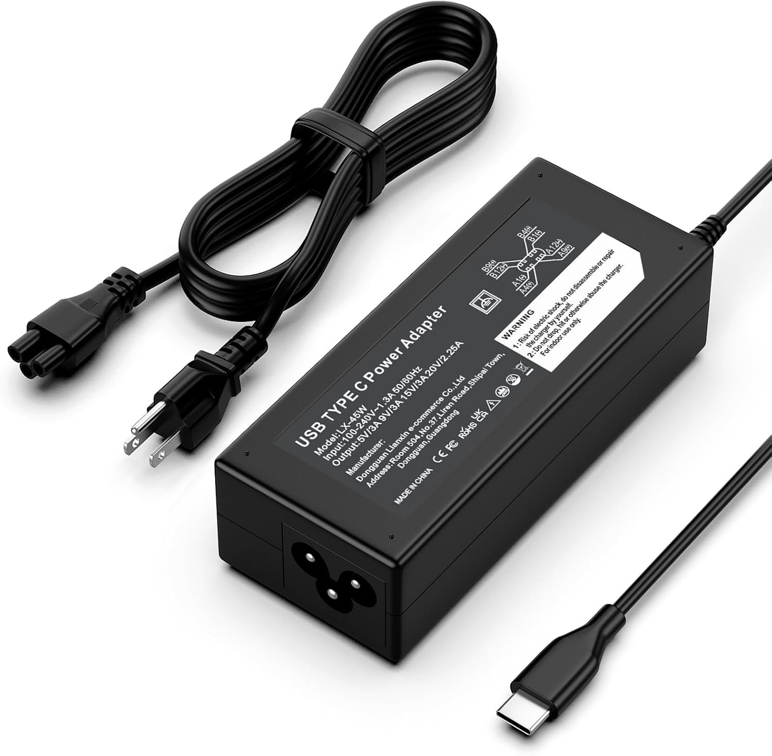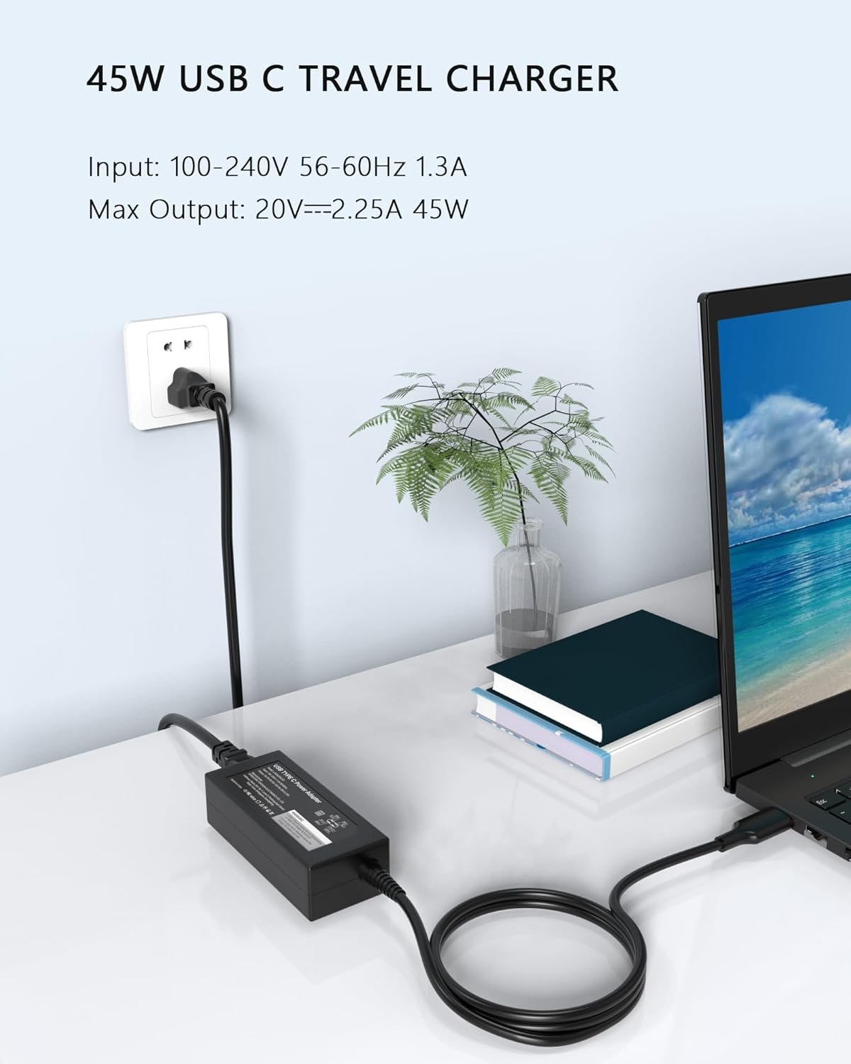 Input: 100-240v~1.3a 56-60hz; Output: 5V–3A, 9V–3A, 15V–3A, 20V–2.25A; Power: 45W; Connector: USB-C, Type C ( click “Ctrl +F” to search your laptop model )