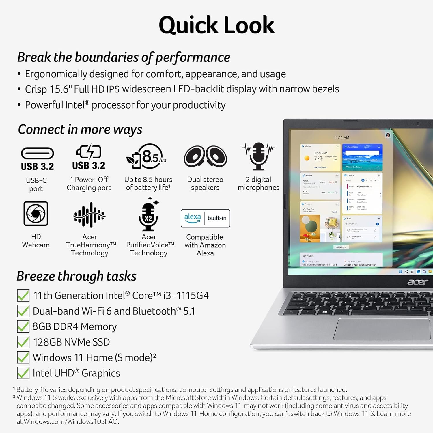 Powerful Productivity: 11th Generation Intel Core i3-1115G4 Dual Core processor delivers unmatched speed and intelligence, enabling impressive creating, productivity, and gaming experiences. With Turbo Boost Technology, get up to 4.1GHz for your high-demand applications. Connectivity Technology: Wi-Fi, Bluetooth, HDMI