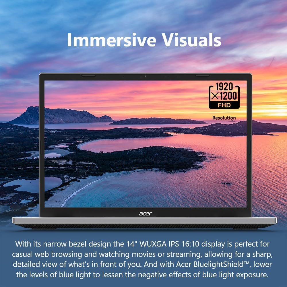 Immersive Visuals: With its narrow bezel design the 14″ WUXGA IPS 16:10 display is perfect for casual web browsing and watching movies or streaming, allowing for a sharp, detailed view of what’s in front of you. And with Acer BluelightShield, lower the levels of blue light to lessen the negative effects of blue light exposure.