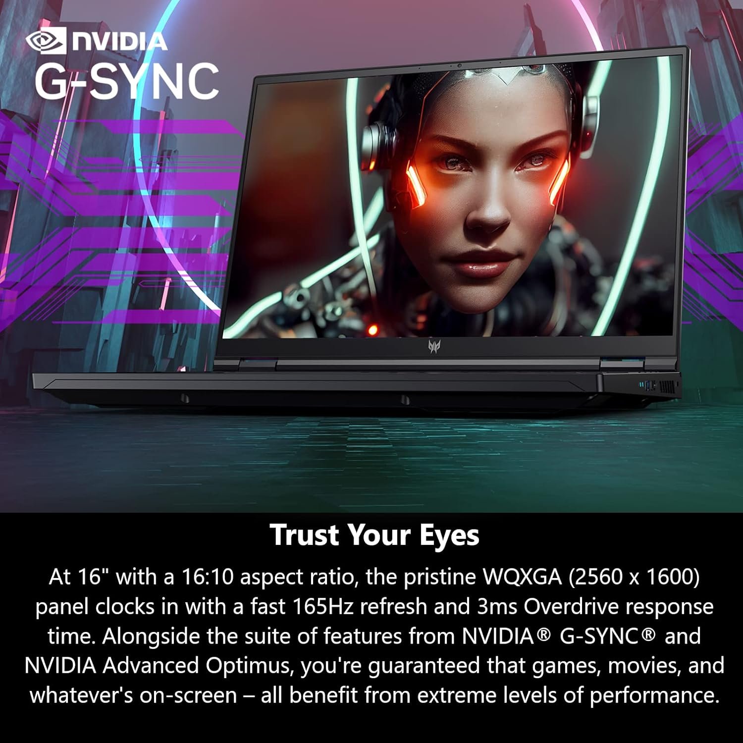 Trust Your Eyes: At 16 inches with a 16:10 aspect ratio, the pristine WQXGA LED panel clocks in with a fast 165Hz refresh and 3ms Overdrive response time. Alongside the suite of features from NVIDIA G-SYNC and NVIDIA Advanced Optimus, you’re guaranteed that games, movies, and whatever’s on-screen – all benefit from extreme levels of performance.