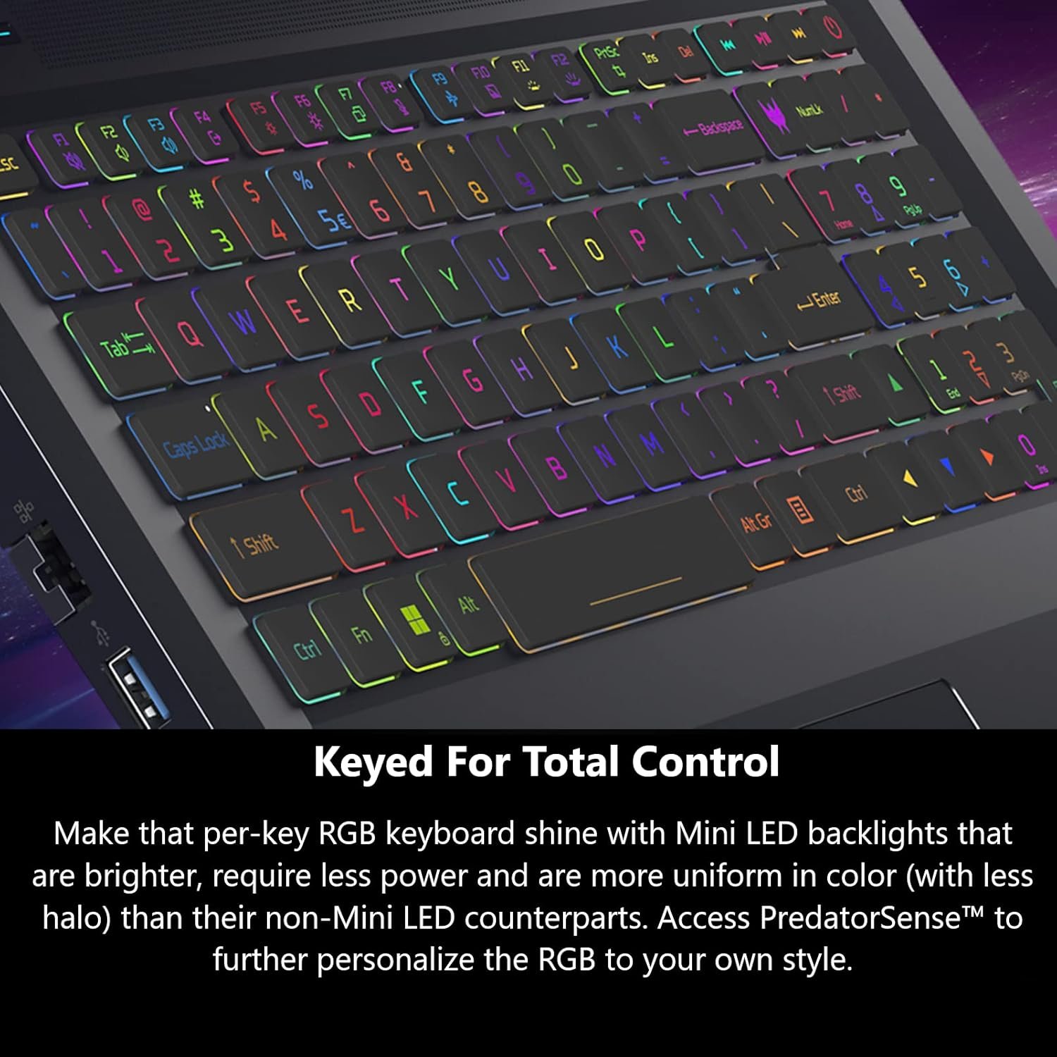 Keyed For Total Control: Make that per-key RGB keyboard shine with Mini LED backlights that are brighter, require less power and are more uniform in color (with less halo) than their non-Mini LED counterparts. Access PredatorSense to further personalize the RGB to your own style.