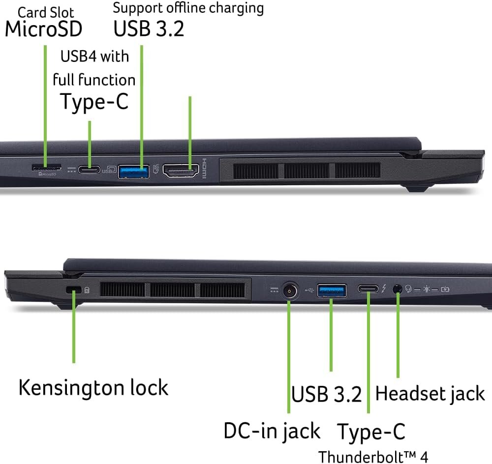Ports For All Your Accessories: 1 – Thunderbolt 4 Port | 1 – USB Type-C Port USB 3.2 Gen 2 (up to 10 Gbps) DisplayPort over USB Type-C & USB Charging (Up to 90W)| 2 – USB 3.2 Gen 2 ports (One Featuring Power-off Charging) | 1 – HDMI 2.1 Port supporting 48 Gbps, 10K maximum resolution, Fixed Rate Link | 1 – Headphone/Speaker/Line-out Jack with Support for High Impedance Headsets (Up to 600ohm) | DC-in for AC adapter | 1 – Kensington Lock Slot | Dimensions: 12.75 (W) x 10.03 (D) x 0.45/0.82 (H) inches | Weight: 4.19 lbs.
