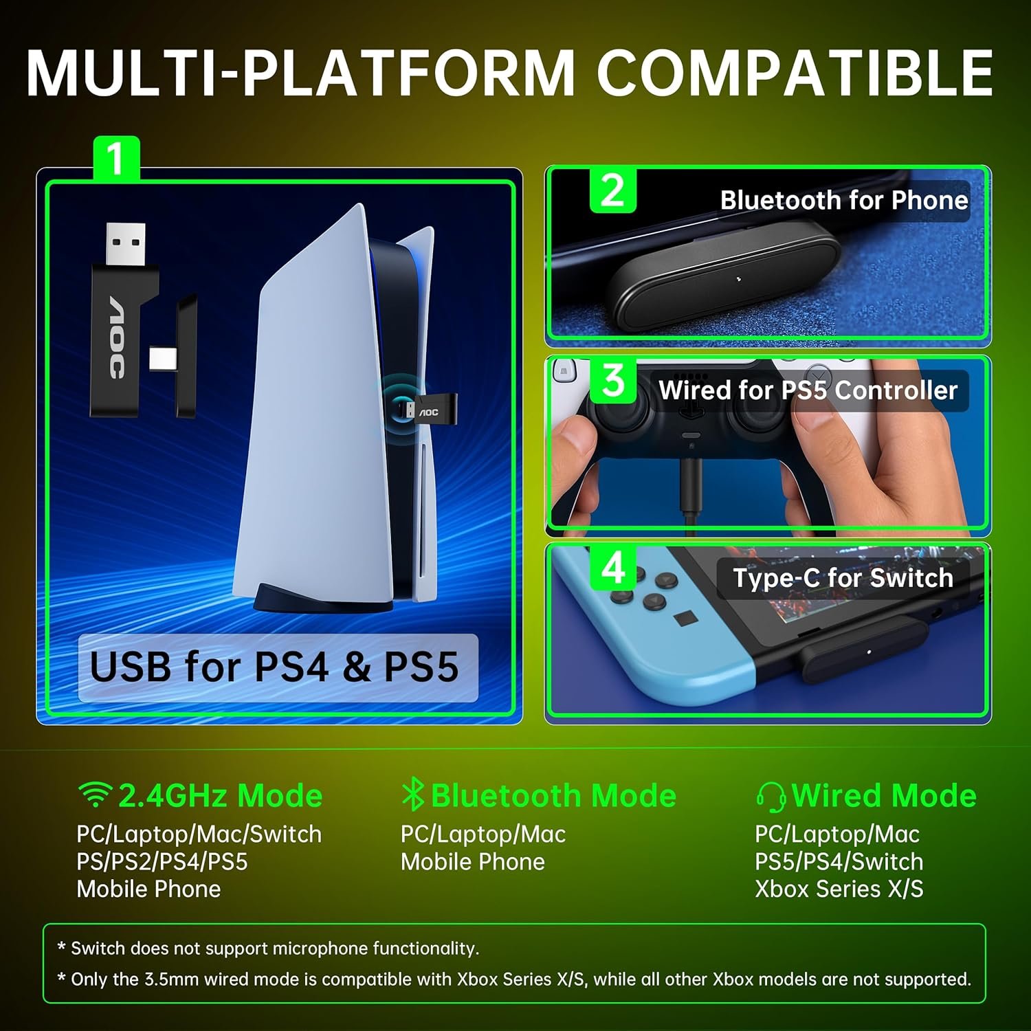 【4-in-1 Universal Connectivity】AOC ps5 Headset is equipped with USB-A, Type-C, Bluetooth 5.4, and 3.5 mm wired modes, this single gaming headset wireless plugs into consoles, mobile devices, and more—eliminating the need for multiple adapters or extra purchases. * Bluetooth modes are incompatible with ps5.