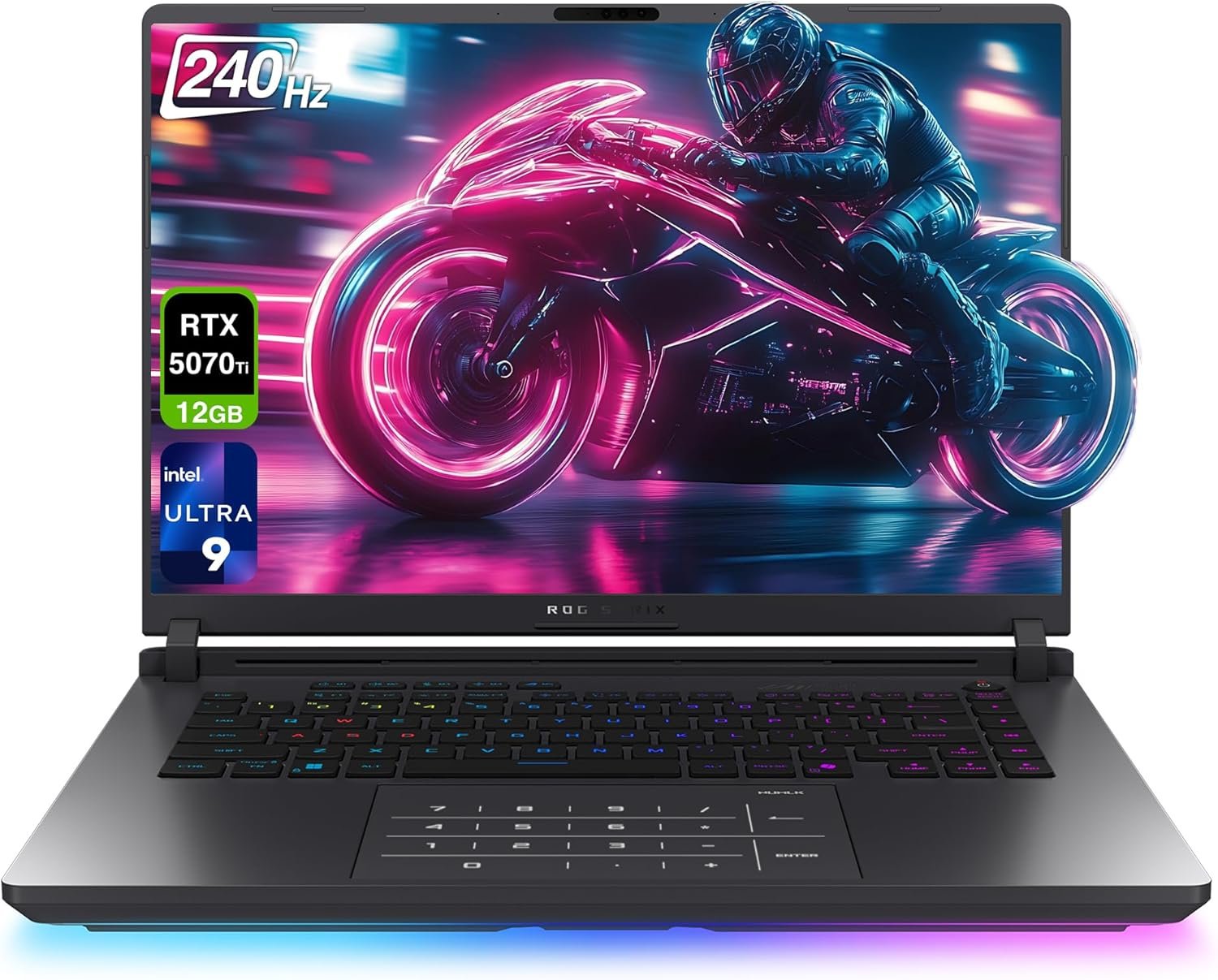 CUTTING-EDGE PERFORMANCE – Experience next-level performance with Windows 11, an Intel Core Ultra 9 275HX Processor, and an NVIDIA GeForce RTX 5070 Ti Laptop GPU powered by the NVIDIA Blackwell architecture and featuring DLSS 4 and Max-Q technologies. HIGH-PERFORMANCE MEMORY AND STORAGE PREMIUM ROG NEBULA DISPLAY – Immerse yourself in stunning visuals with the ultra-fast 240Hz/3ms display ideal for gaming, creation, and entertainment. Featuring a new ACR film that enhances contrast and reduces glare. STATE-OF-THE-ART ROG INTELLIGENT COOLING – ROG’s advanced thermals keep your system cool, quiet and comfortable. State of the art cooling equals best in class performance. Featuring an end-to-end vapor chamber, tri-fan technology and Conductonaut extreme liquid metal applied to the chipset delivers fast gameplay. CUSTOMIZABLE FULL-SURROUND RGB LIGHTBAR – Showcase your style with a full-surround RGB light bar that syncs with your keyboard and ROG peripherals. In professional settings, Stealth Mode turns off all lighting for a sleek, refined look.