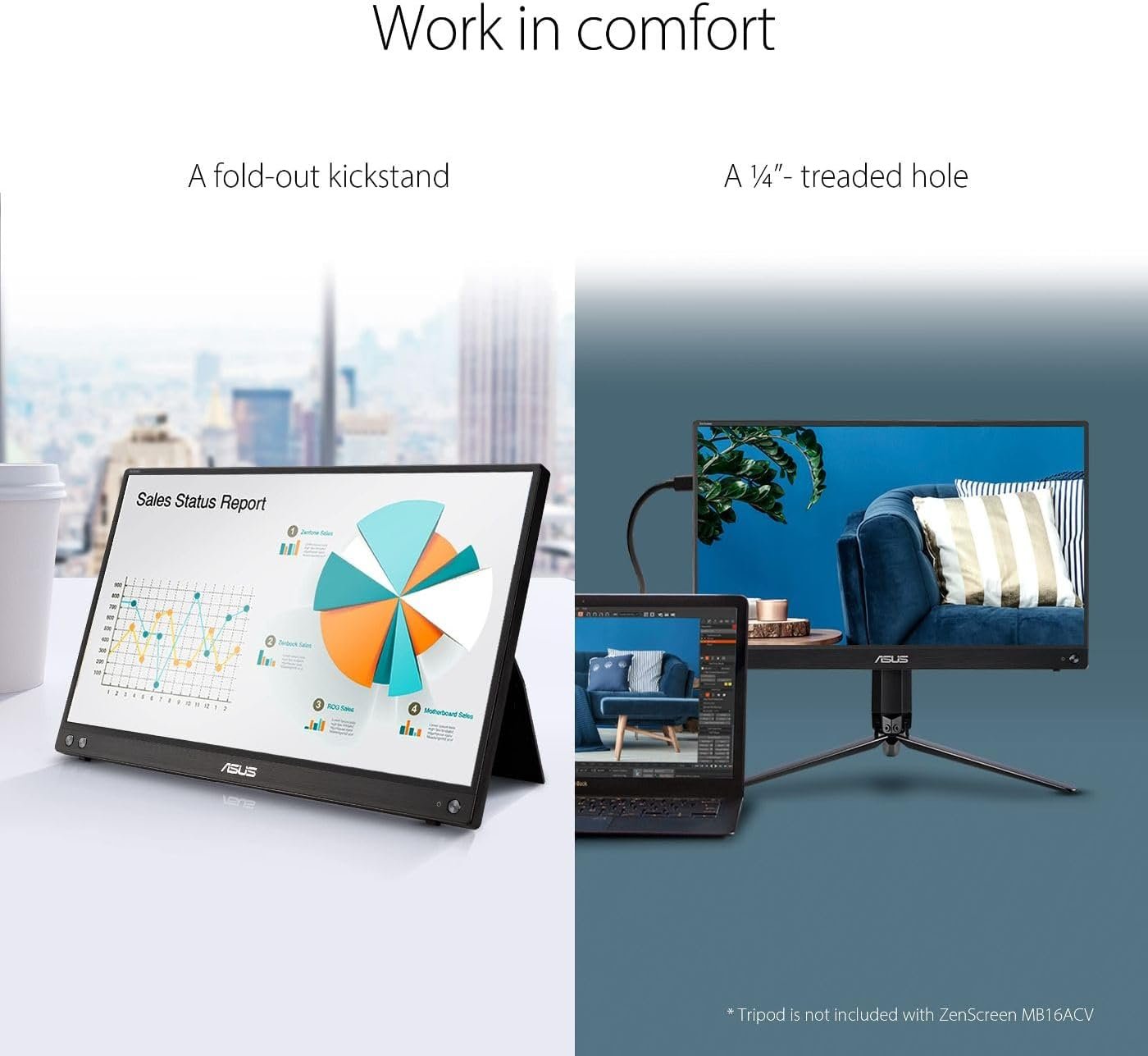 The 15.6” ASUS ZenScreen MB16ACV portable monitor features a kickstand design and an innovative USB-C hybrid-signal connection that handles both power and video signals for quick connections on-the-go. it is an ideal travel companion for laptops to maximize work efficiency and simplicity.