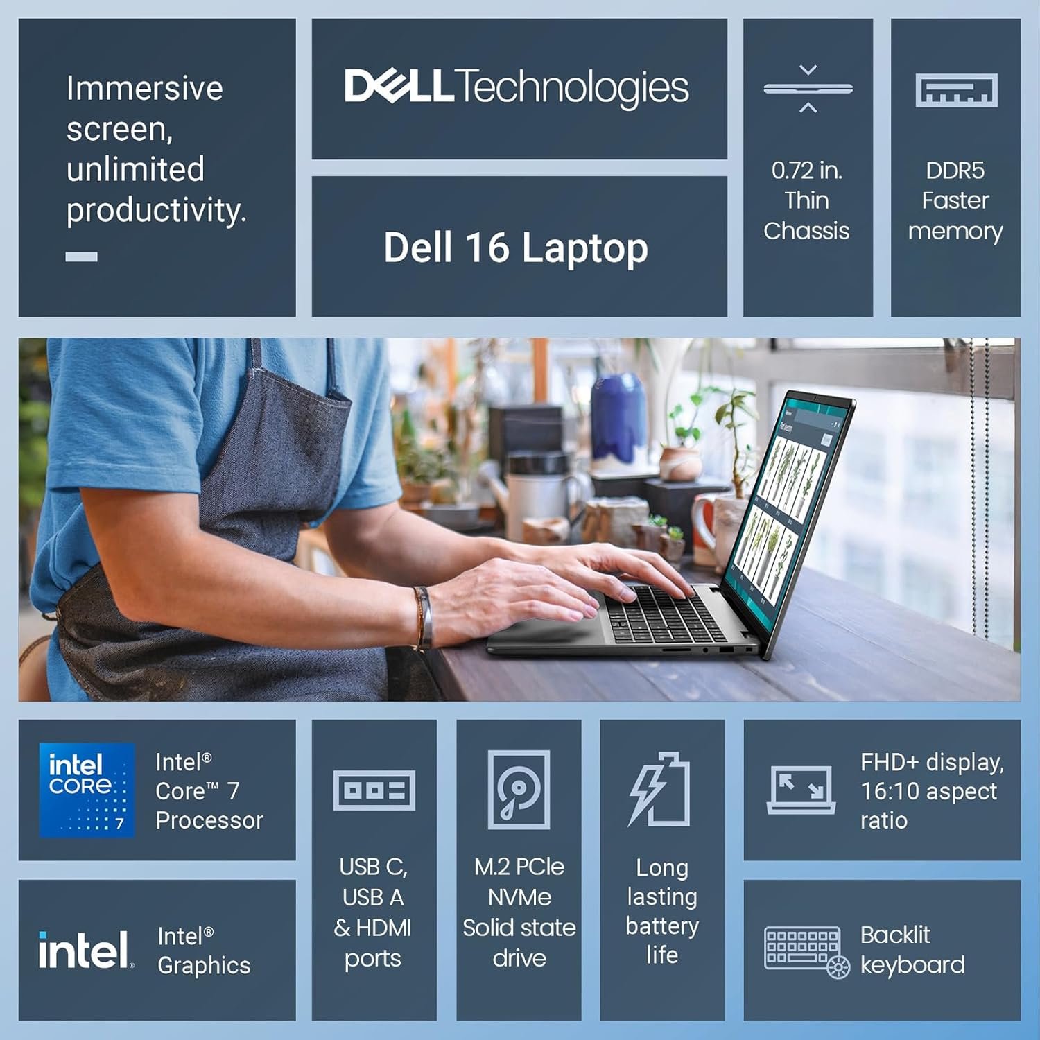 POWERFUL PERFORMANCE: The Dell 16 laptop is equipped with a 10-core, 12-thread Intel Core 7 processor, outperforming the 13th Gen Intel Core i7-1355U. The Dell laptop touchscreen computer delivers smooth, responsive performance for multitasking, creative projects, and everyday work . Advanced adaptive thermals ensure the Dell 16 inch laptop stays cool and efficient whether at your desk or on the go