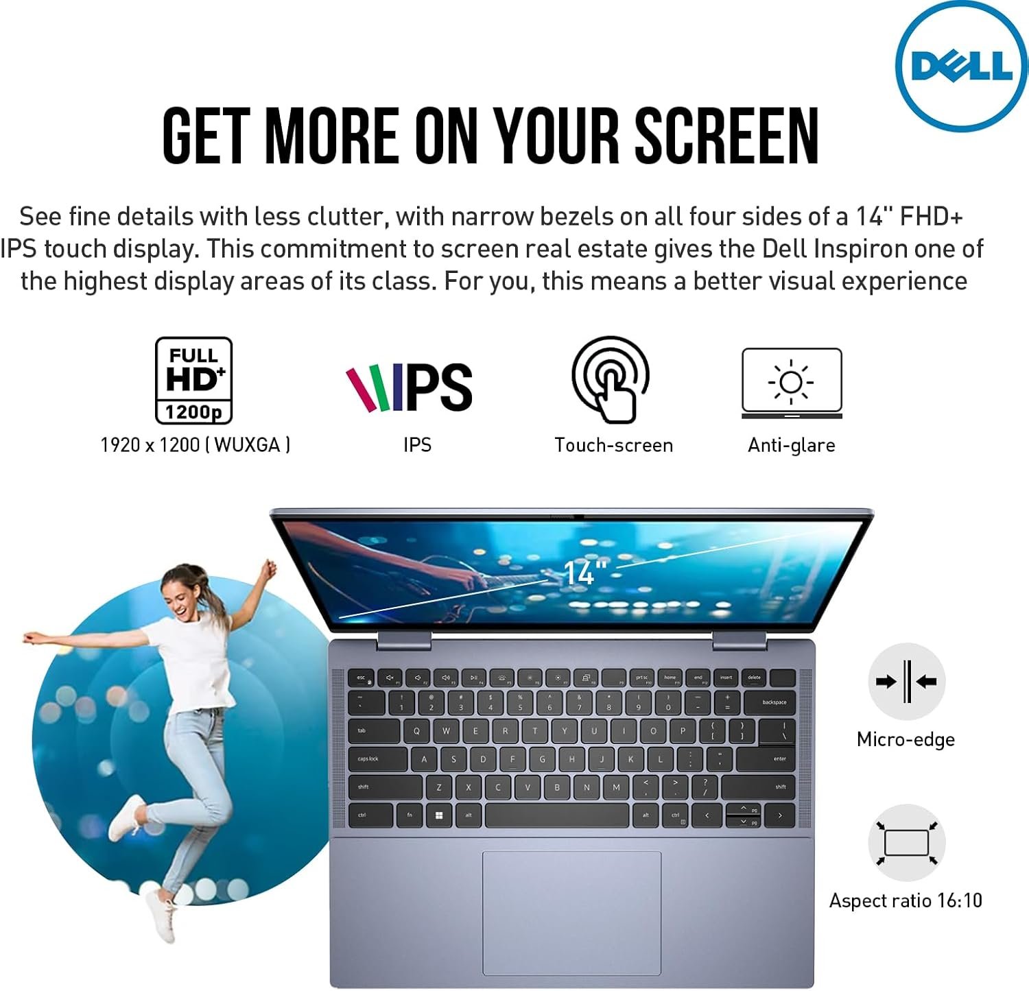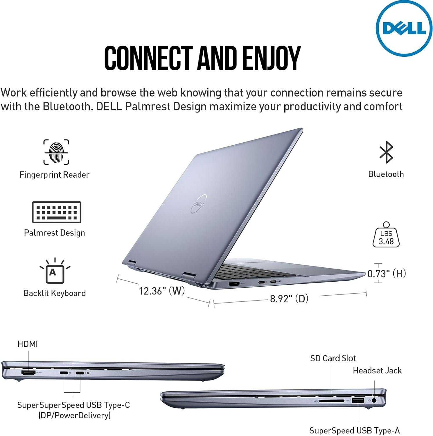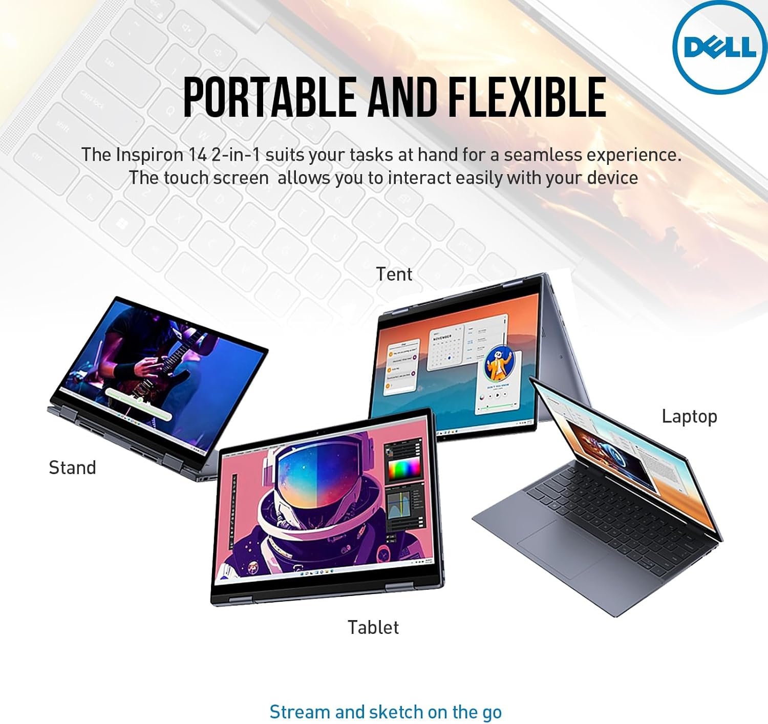 【STREAM AND SKETCH ON THE GO】The Dell Inspiron 14 2-in-1 laptop touchscreen suits your tasks at hand for a seamless experience. Optimized for productivity with 2x SuperSuperSpeed USB-C (DP/PowerDelivery), 1x SuperSpeed USB-A, HDMI, SD Card Reader. Long battery life (up to ~14 hours) with ExpressCharge. Killer Wi-Fi 6E (MU-MIMO) and Bluetooth. Elevate your presence with 1080p FHD camera and captivating audio tuned by Doby Atmos spatial audio and Waves MaxxAudio Pro with two up-firing speakers