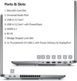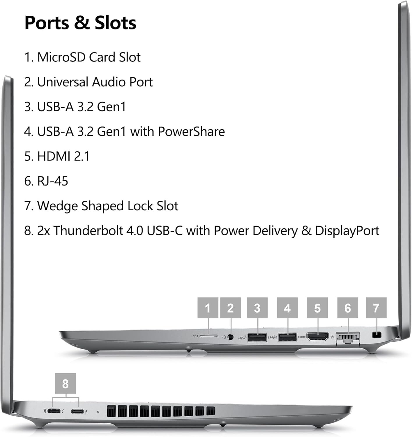 1. MicroSD Card Slot 2. Universal Audio Port 3. USB-A 3.2 Gen1 4. USB-A 3.2 Gen1 with PowerShare 5. HDMI 2.1 6. RJ-45 7. Wedge Shaped Lock Slot8. 2x Thunderbolt 4.0 USB-C with Power Delivery & DisplayPort