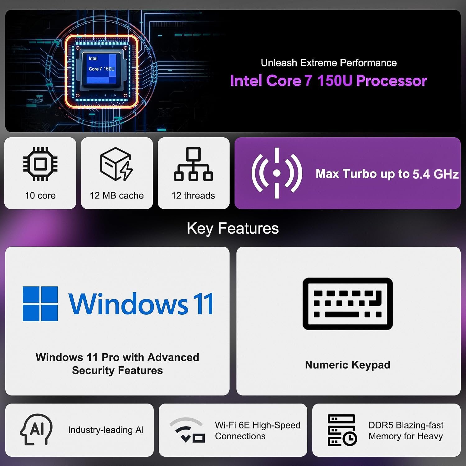 Processor: Intel Core 7 150U (10 cores, 12MB cache, 12 threads, up to 5.4 GHz Max Turbo)