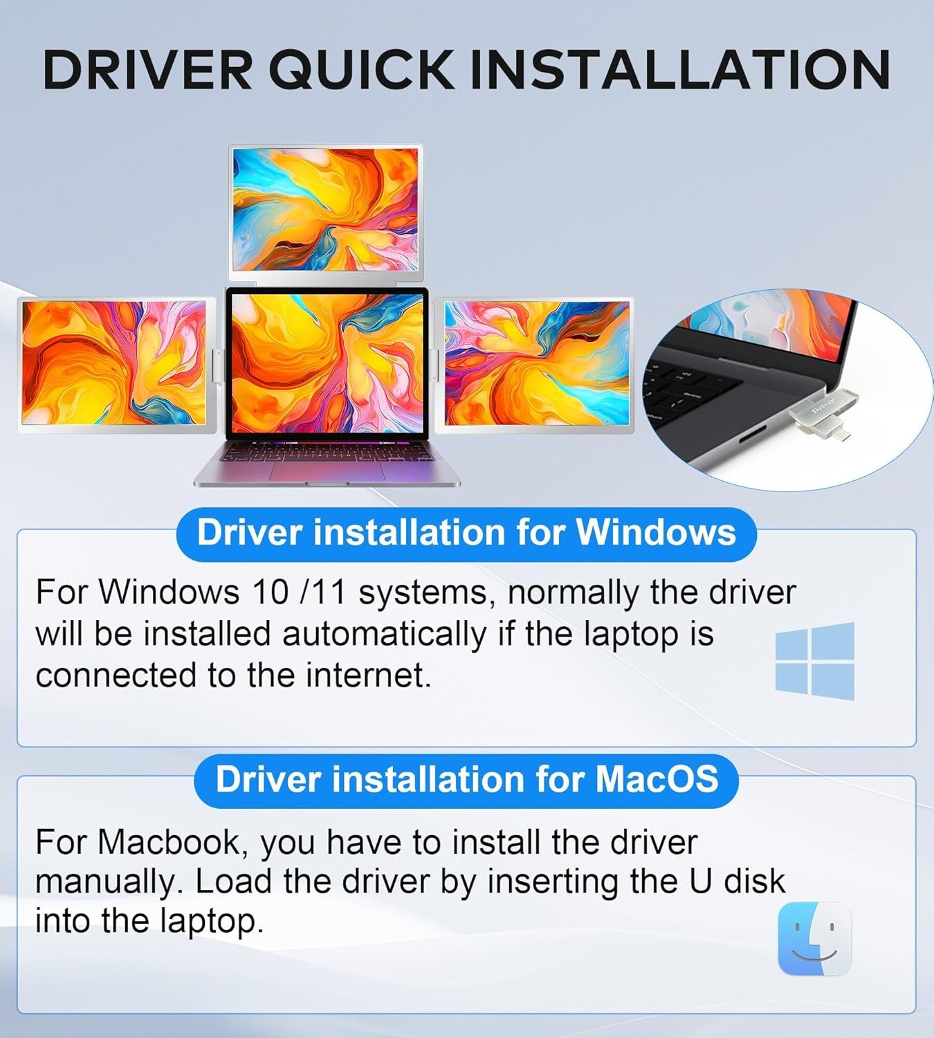 Seamless Connectivity: With Just 1 Cable for 3 Screens, our laptop screen extender is compatible with Windows (Win10 and later) and macOS (2019 or later Macbooks including M1, M2, M3 chipsets) for laptops ranging from 13.6″ to 17.3″. (Please note: Not applicable to Microsoft Surface series and Chormebook). Whether you choose a USB-C or USB-A connection(Support: Thunderbolt 3/4/ USB-C/ USB-A), it’s easy to connect with just 1 cable. (Please connect PD power supply when you use the quad monitor.)