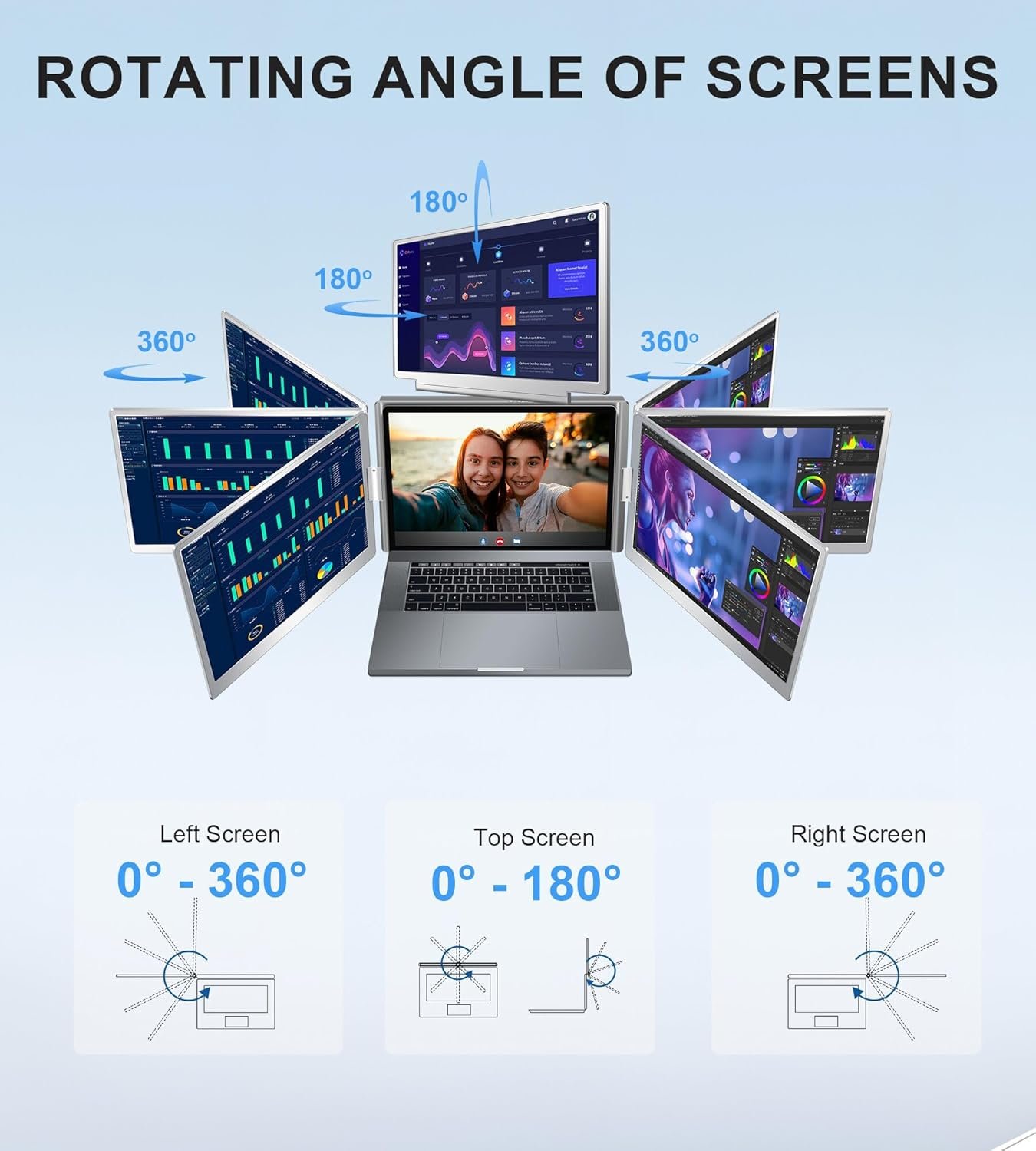 Versatile Design for Any Scenario: The auto-sensitive design of the FOPO laptop screen extender supports 0-360° rotation, allowing you to adjust the angle for presentations or screen sharing. Its lightweight structure ensures you can easily set up your quad monitor workspace on the go.