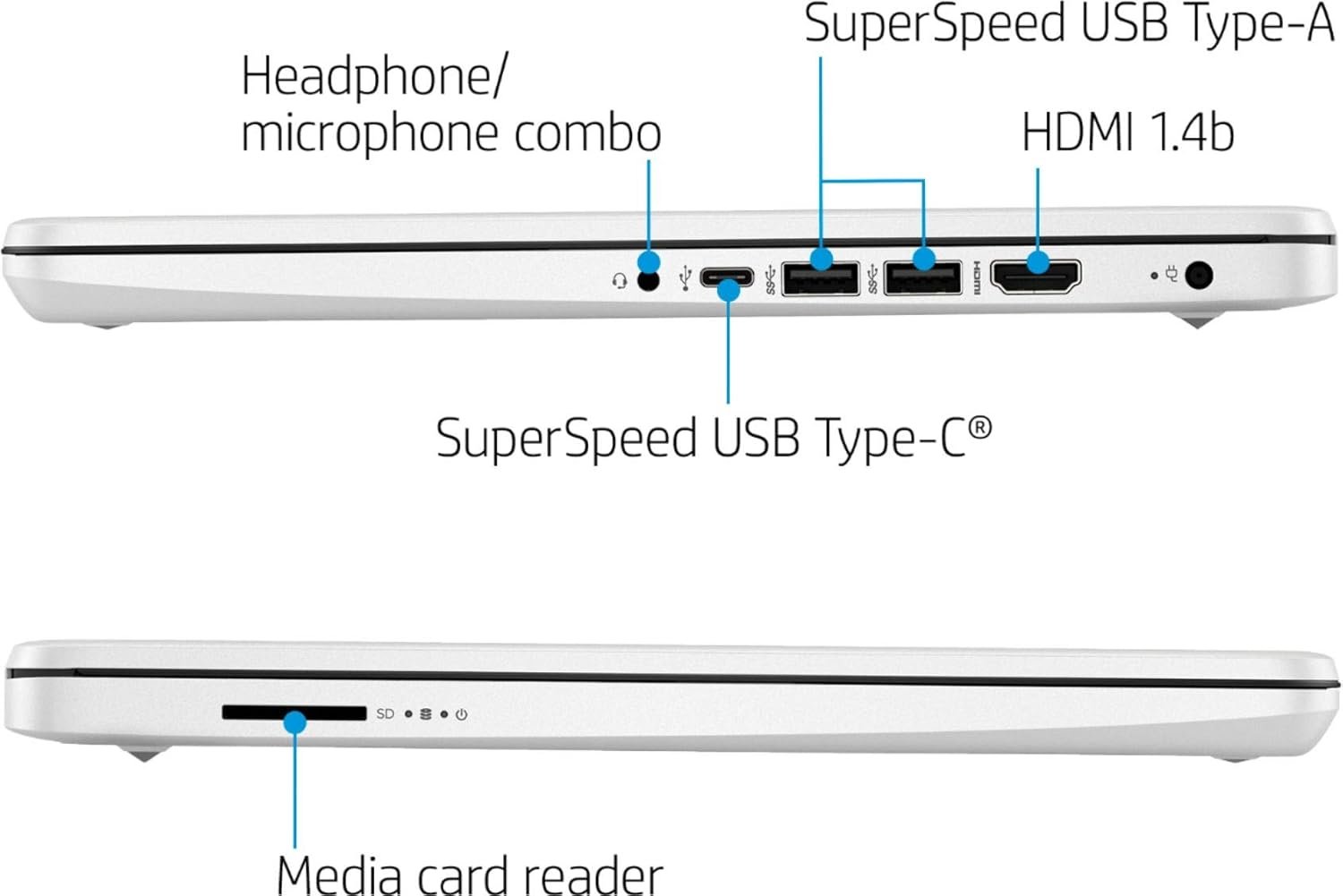 14.0-inch diagonal, HD (1366 x 768), micro-edge, BrightView non-touch display. Keyboard deck: Snow white with a vertical brushed pattern; Full-size keyboard; HP Imagepad with multi-touch gesture support; Wireless connectivity: Realtek RTL8822CE 802.11a/b/g/n/ac (2×2) Wi-Fi and Bluetooth 5.0 combo; 1x USB 3.1 Gen 1 Type-C (Data Transfer Only, 5 Gb/s signaling rate); 2x USB 3.1 Gen 1 Type-A (Data Transfer Only); 1x AC smart pin; 1x HDMI 1.4b; 1x headphone/microphone combo