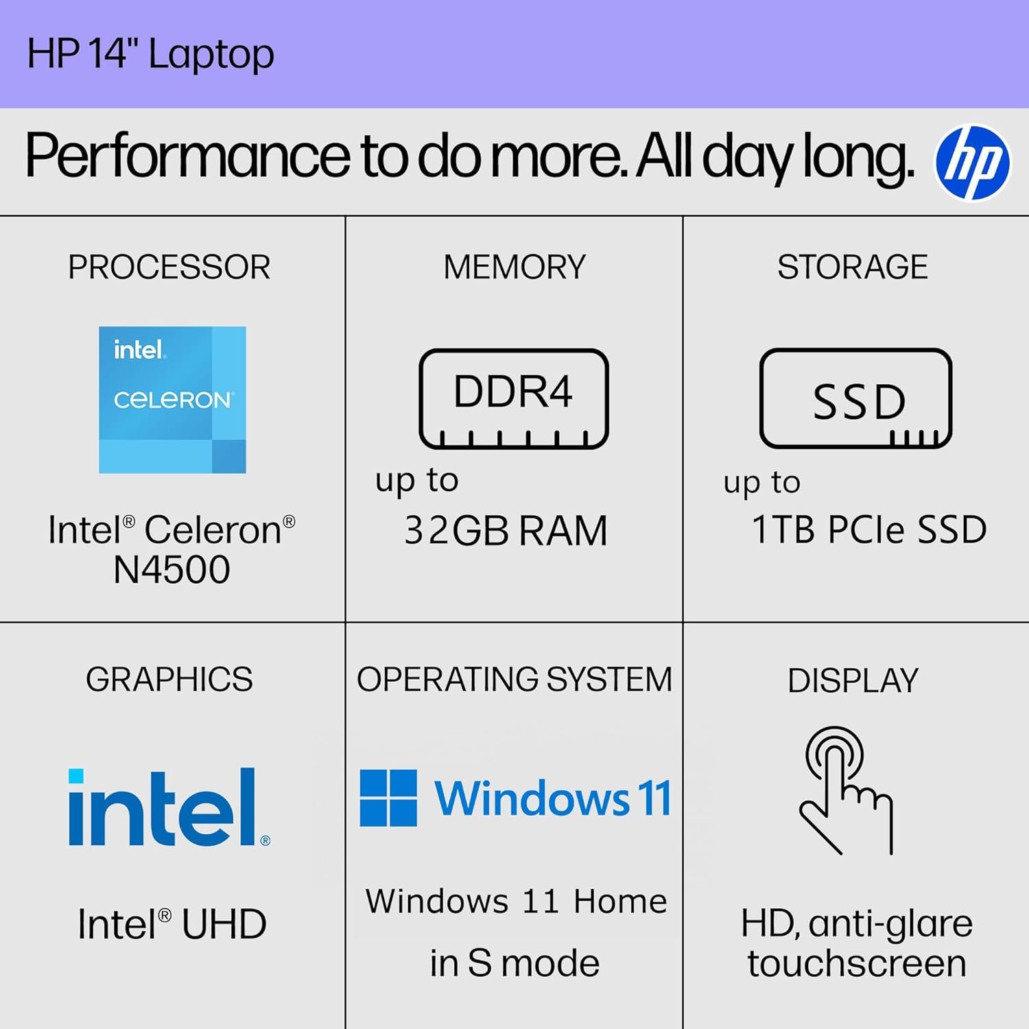 Powered by the Intel Celeron N4500 Processor @ 1.10GHz ( 2 Cores, 4M Cache, up to 2.80 GHz), the HP 14 laptop ensures smooth, responsive computing – perfect for work, web browsing, or light content creation