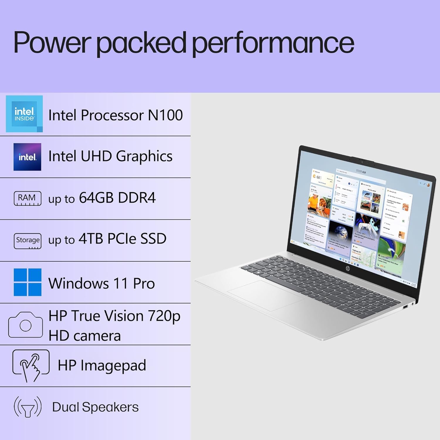 Designed for everyday needs, this HP 15.6″ FHD laptop features a Intel Processor N100 processor (up to 3.4 GHz with Intel Turbo Boost Technology, 6 MB L3 cache, 4 cores, 4 threads).