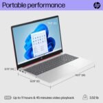 The HP 15.6″ HD Laptop packs in the reliable processing power of an Intel N200 processor, plus ample 128 GB UFS storage, powerful graphics and design with recycled materials, to give you the power and capacity to do more. Chat with ease knowing you have HD resolution with a camera you can close when not in use, keeping you safe online. Get every point across with dual array digital microphones and advanced noise reduction software. The long-lasting battery life and HP Fast Charge help you stay in the zone longer. Effortlessly take on your day and see the content that matters most with a 85% screen-to-body ratio and crisp quality display. Stay in your flow with plenty of ports to connect your devices. This PC is built to keep you in your flow, wherever that might be. Windows 11 Home in S mode is the most secure Windows ever built with fast boot times, increased responsiveness, and added protection against phishing and malware. 1-Year Microsoft 365 Personal subscription included with this PC.