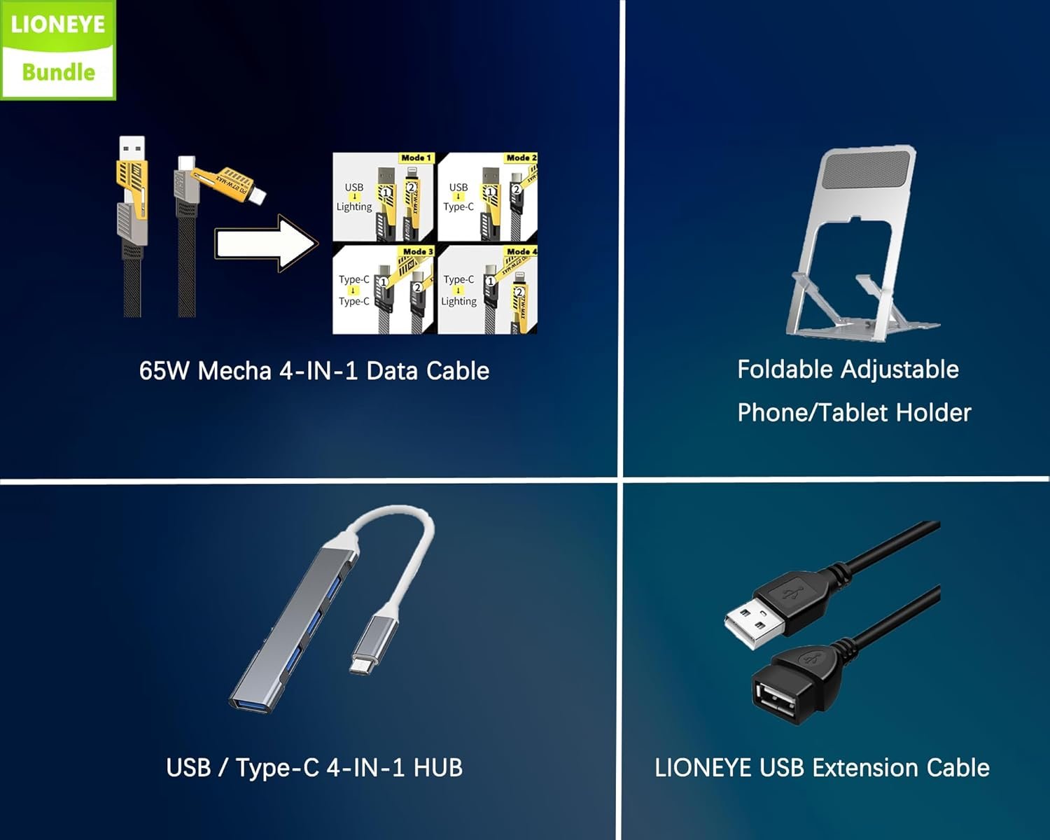Foldable Adjustable Phone/Tablet Holder + 65w Mecha Data Cable + USB/Type-C 4-IN-1 HUB + LIONEYE USB Extension Cable