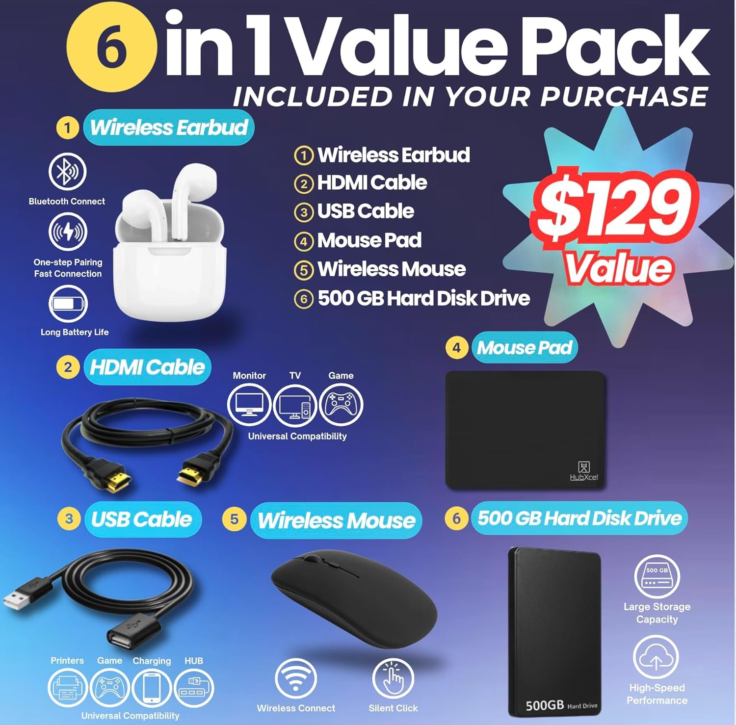 Accessory: HubxcelAccessory (Wireless earbuds, USB extension cord, HDMI cable, mouse pad, wireless mouse, and 500GB external hard drive.)