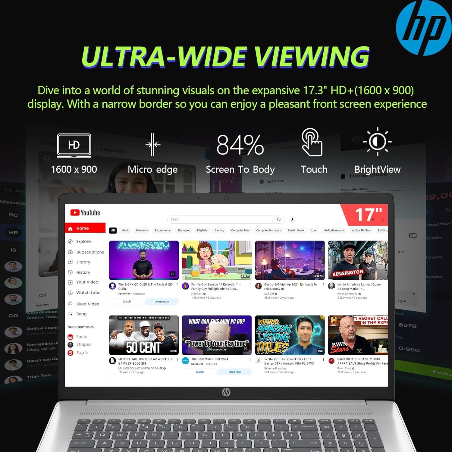 SEE MORE, DO MORE: The high performance HP laptop touchscreen computer features a stunning 17.3 inch HD+ (1600 x 900) BrightView Touch with sharp details and vivid color. With slim bezel and big screen, the large HP laptop 17 inch screen provides a more immersive viewing experience, making it perfect for tasks that require ample screen real estate. Its slim, sleek, durable design in new vibrant silver finish makes this eye-catching, thin lightweight HP 17.3 touchscreen laptop easily portable