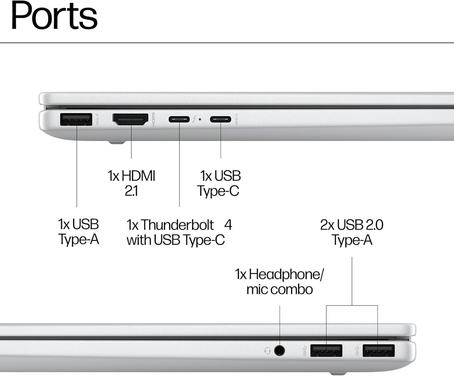 Thunderbolt 4 (USB Power Delivery, DisplayPort 2.1, HP Sleep and Charge), USB Type-C (USB Power Delivery, DisplayPort 2.1, HP Sleep and Charge), 3 x USB Type-A, HDMI 2.1, headphone/microphone combo; Intel Wi-Fi 6E AX211 (2×2) + Bluetooth 5.3, Backlit Keyboard.