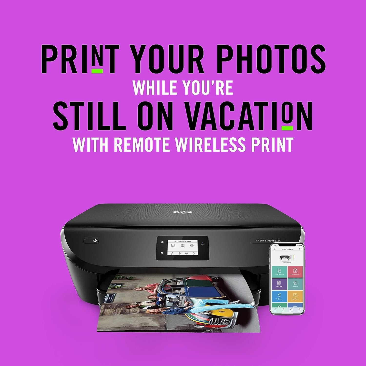 Print vivid, borderless photos with the HP ENVY Photo 6255 all-in-1 wireless printer, and capture every moment and memory in true-to-life detail. Use the 2.2″ mono touchscreen to easily print, scan, and copy, or print on-the-go with the HP Smart app. You can also use the HP Smart app to scan documents using your smartphone camera, print photos from social media or the cloud, and order ink with a tap and swipe. Have confidence in your color printer’s connection with steady performance from dual-band Wi-Fi. Even produce stunning photos for less than 6 cents with HP Instant Ink, and get ink delivered to your door before you run out to save you time and money (subscription required).