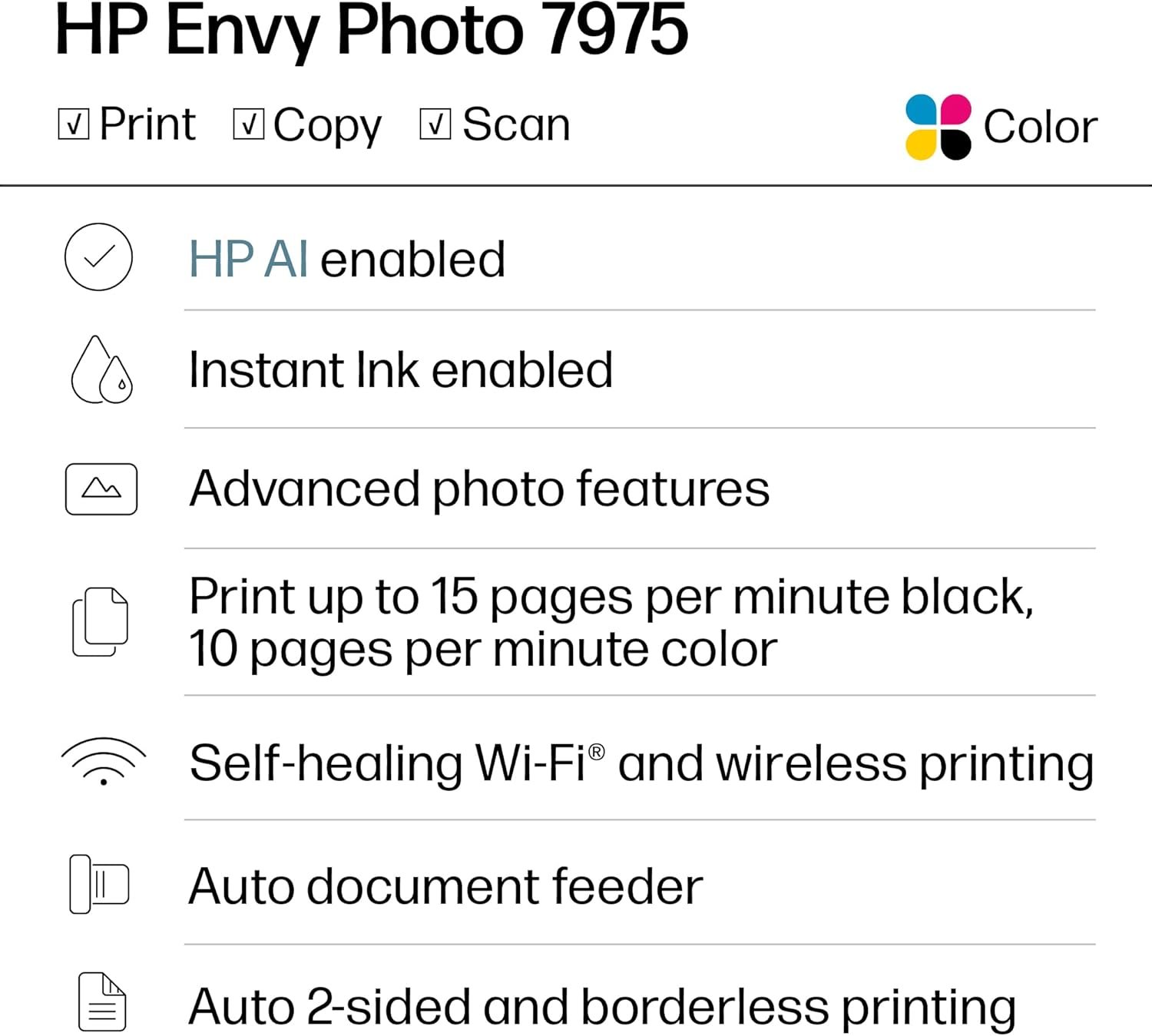 From America’s most trusted printer brand, the HP Envy Photo 7975 is a premium multi-purpose home printer with everything families need to learn, work, and create. Loaded with features to print high-quality photos, homework, office docs and everything else. It’s also AI-enabled to intuitively adapt to your workflow, with wireless and security features that keep your multifunction printer up to date and secure.