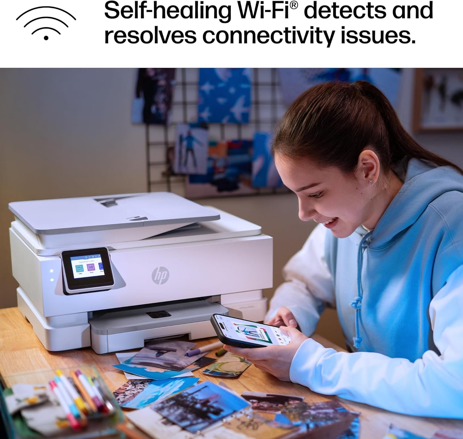 The HP Envy Photo 7975 is a premium multi-purpose home printer with everything families need to learn, work, and create. Loaded with features to print high-quality photos, homework, office docs and everything else. It’s also AI-enabled to intuitively adapt to your workflow, with wireless and security features that keep your multifunction printer up to date and secure.