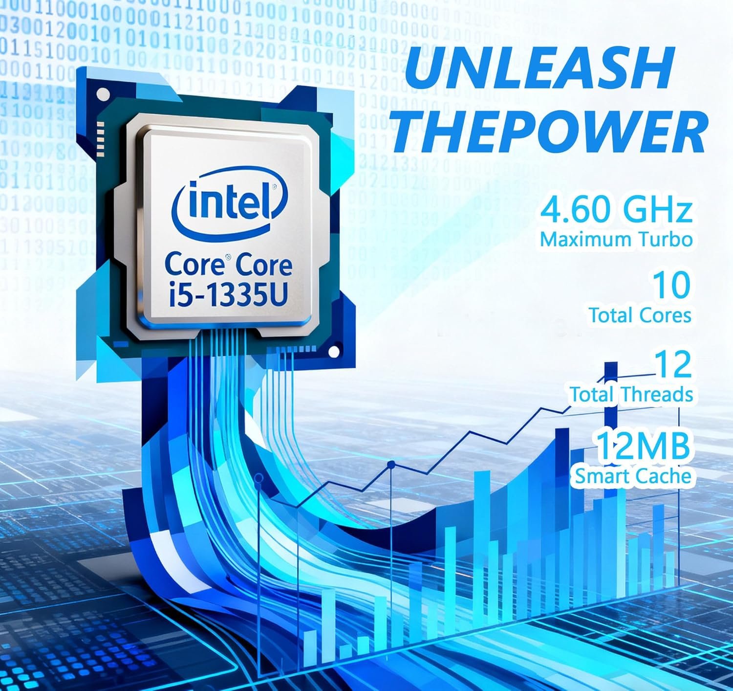 Processor: Intel Core 13th Generation i5-1335U up to 4.6 GHz, 12MB L3 Cache Processor, 10 cores, 12 threads