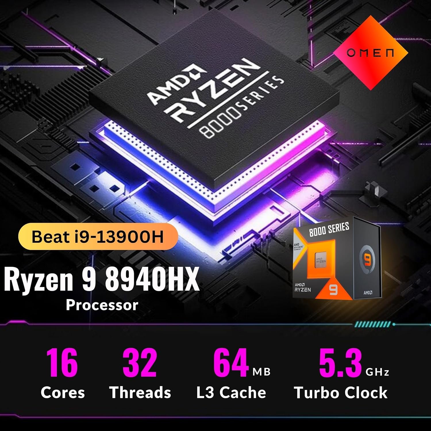 [Processor]: Powered by the AMD Ryzen 9 8940HX processor. 16 cores, 32 threads, 64 MB L3 cache, up to 5.3 GHz frequency. VR-ready HP OMEN laptop, AAA gaming is flawless and streaming is effortless.