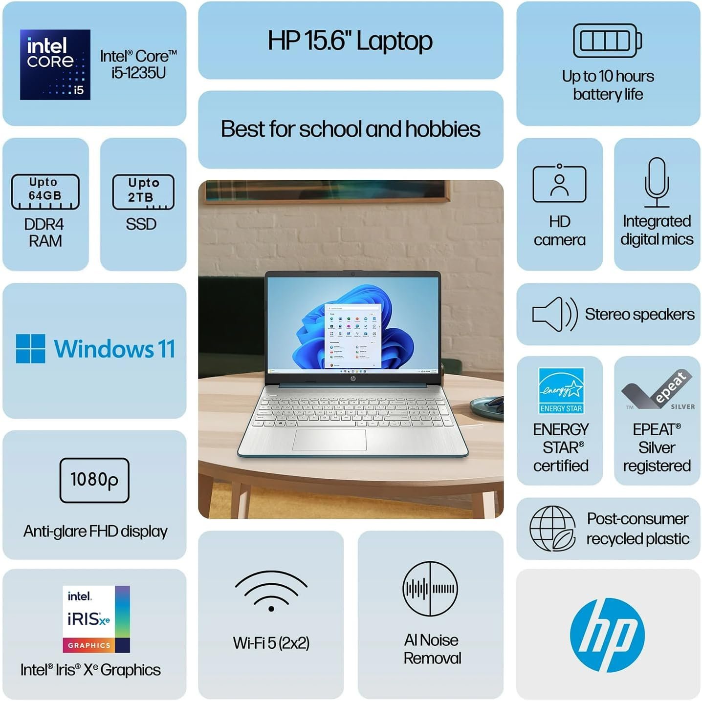 Built-in HD Webcam: HP True Vision HD camera with camera shutter and microphone mute, AI noise removal