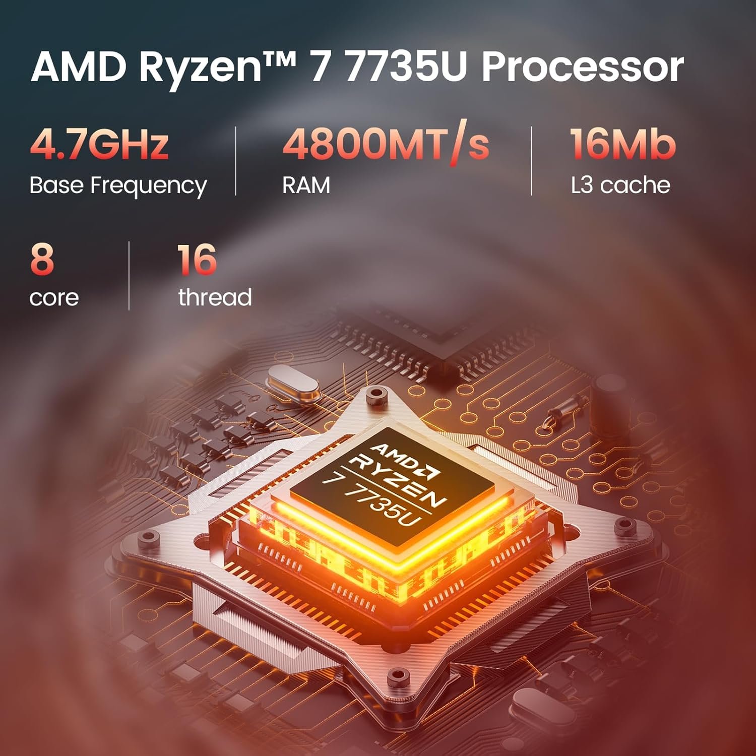 Processor and graphics: AMD Ryzen™ 7 7735U (8 cores, 16 threads, up to 4.7GHz) + Integrated AMD Radeon™ 680M