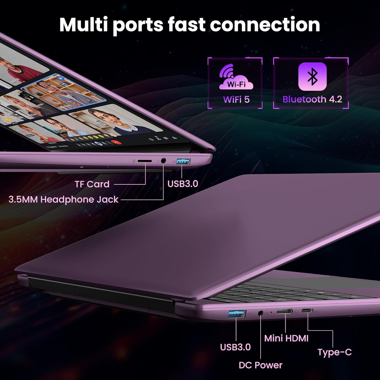 Meeting Multiple Needs: 2x stereo speakers , Bluetooth 4.0 and dual-band Wi-Fi (2.4G/5G) fast wireless.1x Type-C port x1, 1x Mini-HDMI , 1x 3.5mm headphone jack , 2x USB 3.0 port , 1x Micro TF slot , 1x fast charger DC port