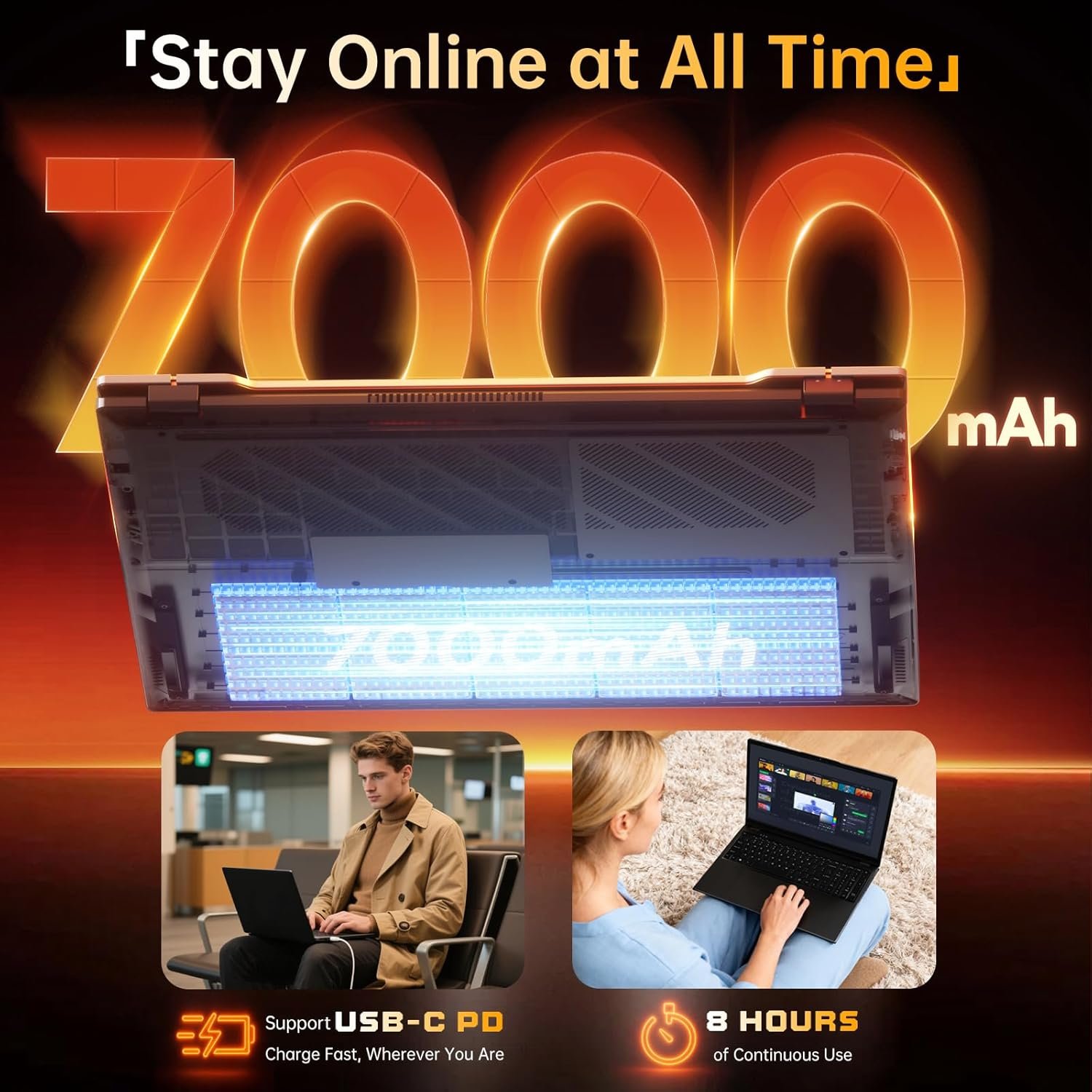 Portable & Long Battery Life & Backlit Keyboard: With a 7000mAh battery and PD fast charging support, this slim and lightweight laptop is easy to carry for students, travelers, and business users, offering flexibility on the go