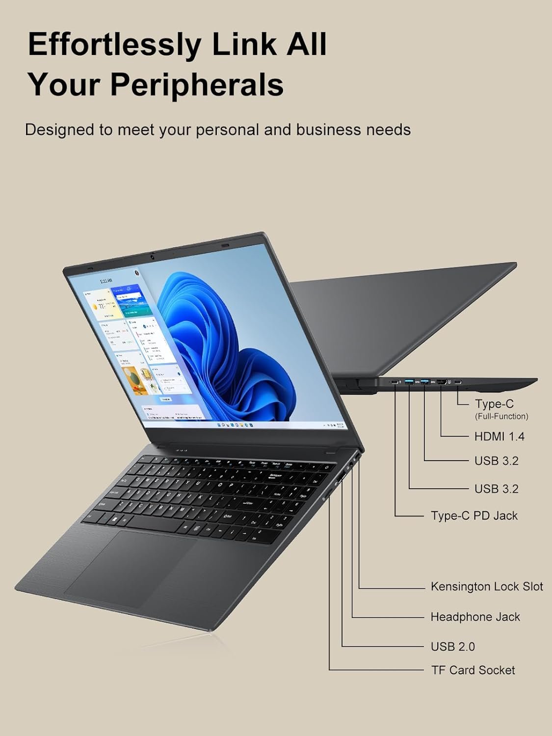 VERSATILE CONNECTIVITY – This Laptop Features USB-C Full-Function Jack, 2x USB 3.2 Jack, 1x USB 2.0 Jack, 1x HD-MI Jack, 1x TF card slot, 1x Headphone Jake, 1x Type-C Charging Jack. It offers powerful wireless connectivity with support for 2.4G+5G WiFi and Bluetooth 5 for fast downloads and streaming. A full-size ergonomic keyboard and spacious touchpad enhance your typing and navigation experience.