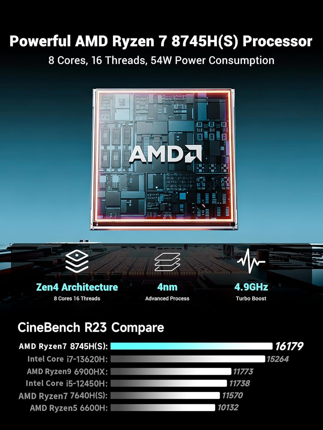 ✔【Hardcore Performance】FIREBAT ultrabook notebook is powered by the AMD Ryzen 7 8745HS (8-core/16-thread) with 4.9GHz turbo speeds, which handles single and multi-threaded tasks effortlessly. Featuring Radeon 780M graphics and 54W of ultra-high performance, delivers stable performance for seamless gaming, content creation, and productivity.