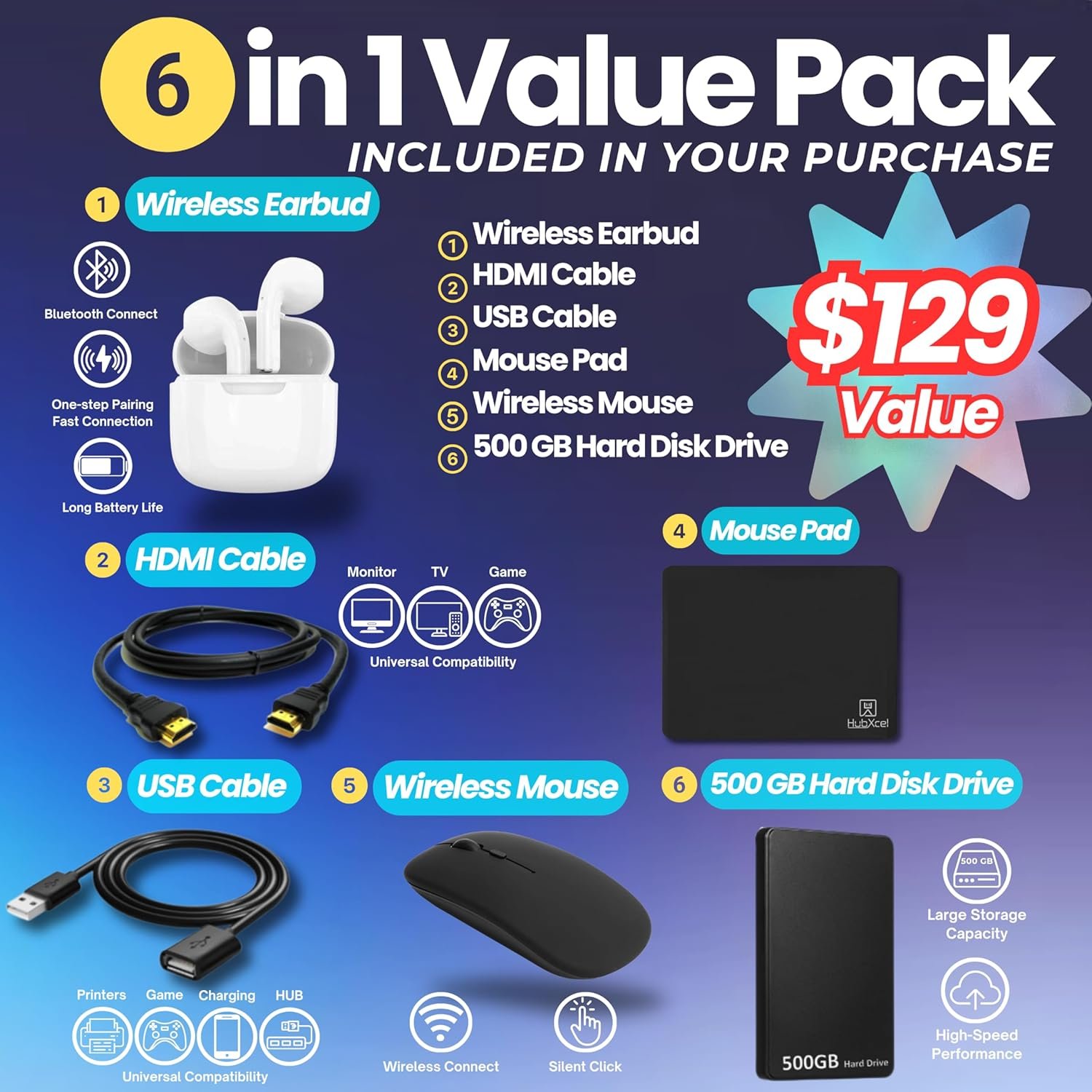 HubxcelAccessory: Includes wireless earbuds, USB extension cord, HDMI cable, mouse pad, wireless mouse, and 500GB external drive.