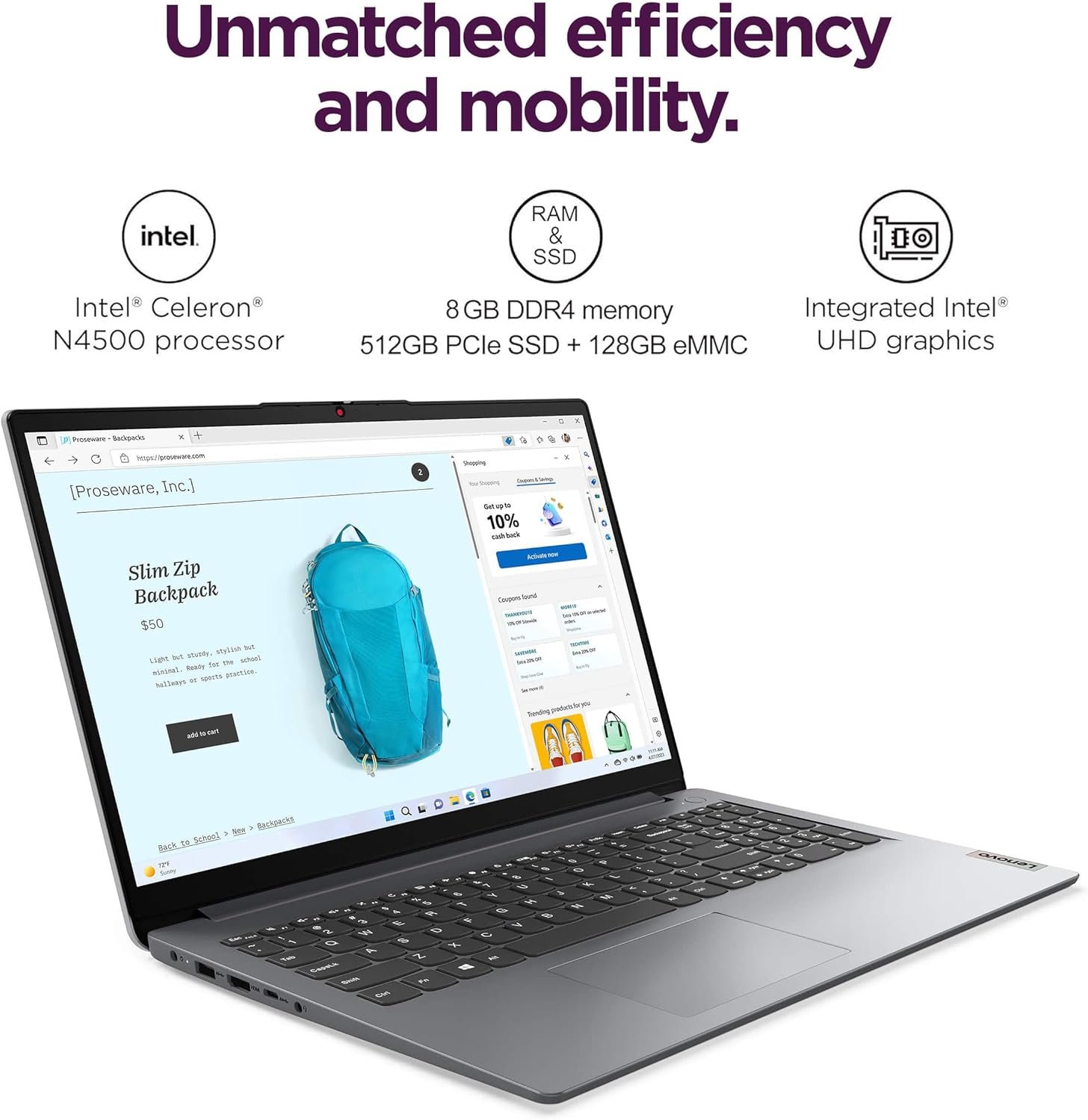 POWERFUL PERFORMANCE – Powered by an Intel Celeron N4500 processor with 2-cores for superior efficiency and speed, 8GB DDR4 RAM for seamless multitasking, and a 512GB PCIe NVMe M.2 SSD + 128GB eMMC for fast storage and reduced load times, ensuring smooth and responsive performance for all your tasks