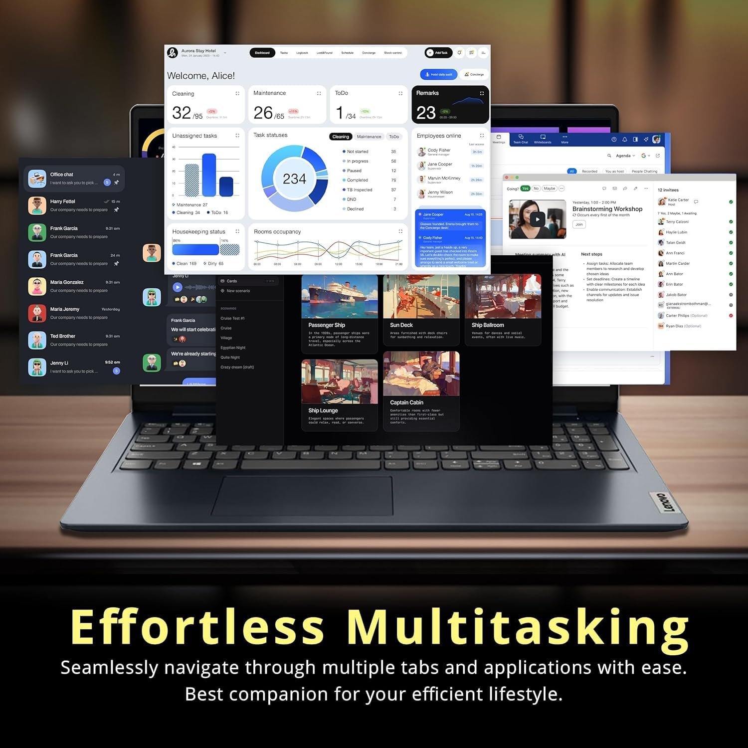 【Key Features】Equipped with Wi-Fi 6 and Bluetooth 5.1 for fast, stable connections. Includes USB-C, USB-A, HDMI, RJ-45, and audio combo jack for versatile connectivity. Features Dolby Audio dual speakers, dual mics, and an HD webcam with privacy shutter for clear communication. The sleek Abyss Blue design blends durability, simplicity, and modern style for everyday productivity.