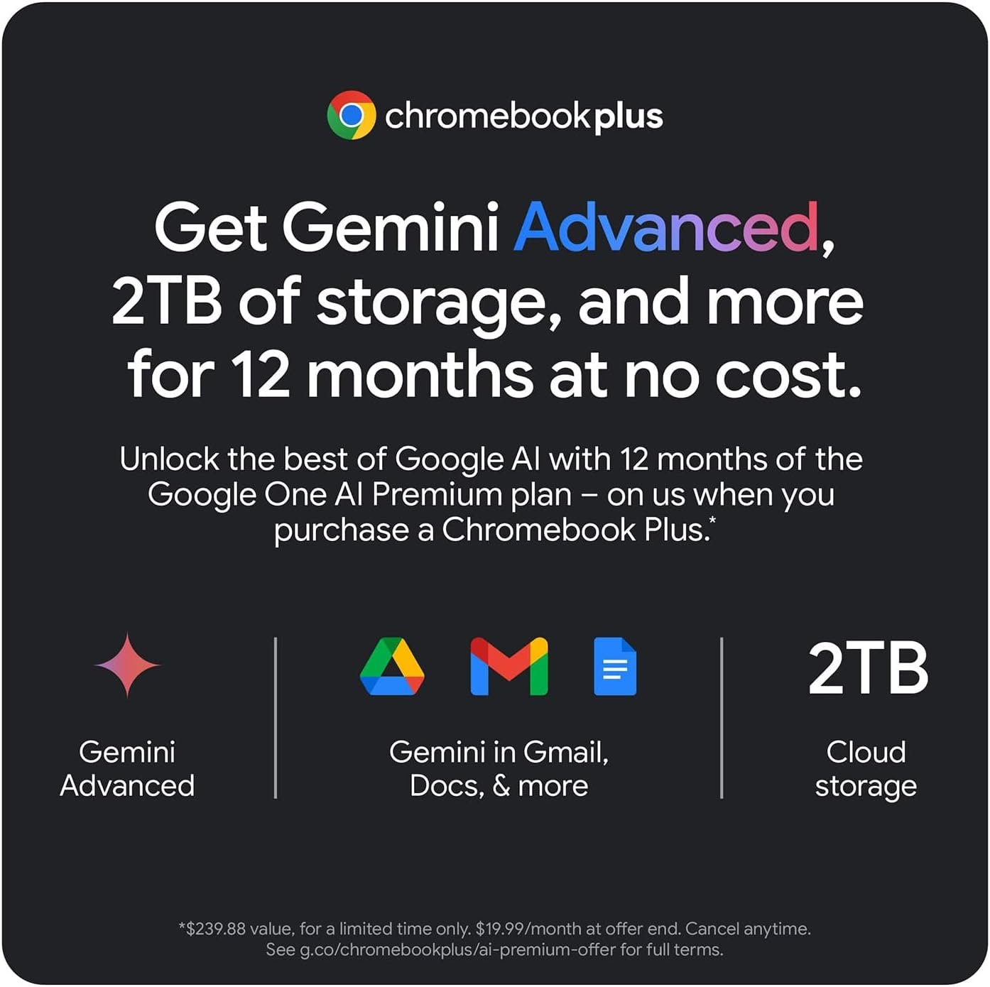 Chromebook Plus comes with 12 months of the Google One AI Premium plan including Gemini Advanced and Gemini in Gmail, Docs, and more to boost your productivity and creativity. Plus, you get 2 TB of secure cloud storage from Google One.