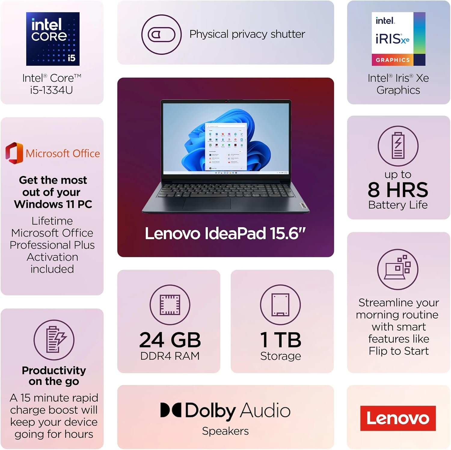 The Newest Lenovo IdeaPad 1i combines power and portability with an Intel Core i5 processor in a sleek 17.9 mm frame. Enjoy effortless multitasking, up to 11 hours of battery life, and quick charging. With narrow bezels, Dolby Audio, Flip to Start, and a privacy-shutter camera with Smart Noise Cancelling, it’s built for work, play, and everything in between.