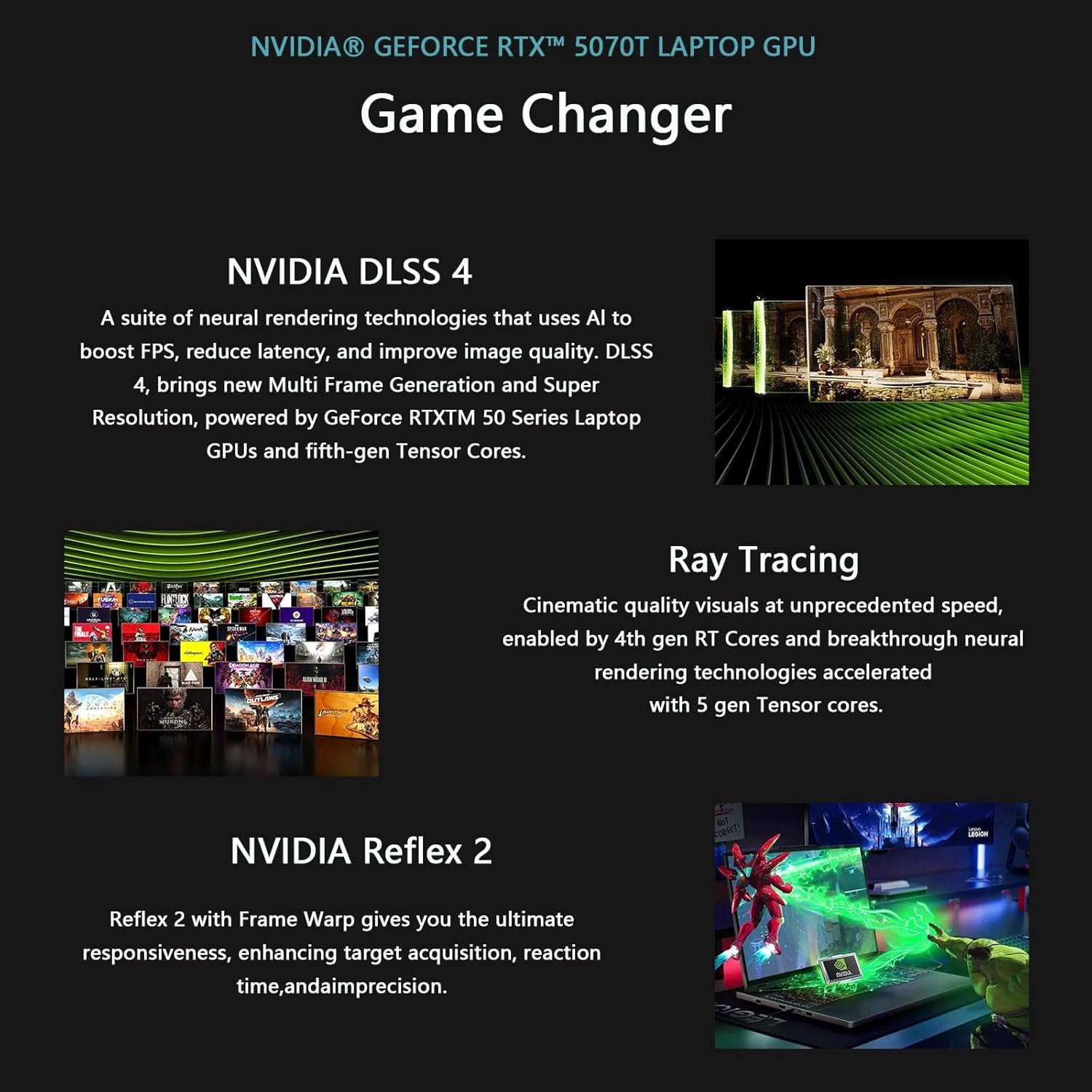 🎮 Top-Tier GPU Experience: Equipped with the dedicated NVIDIA GeForce RTX 5070 Ti Laptop GPU 12GB GDDR7, Lenovo Legion Pro dominates modern gaming and graphics-intensive tasks. NVIDIA DLSS4, a suite of neural rendering technologies that uses Al to boost FPS, reduce latency, and improve image quality, brings new Multi Frame Generation and Super Resolution. Ray Tracing brings cinematic quality visuals at unprecedented speed.