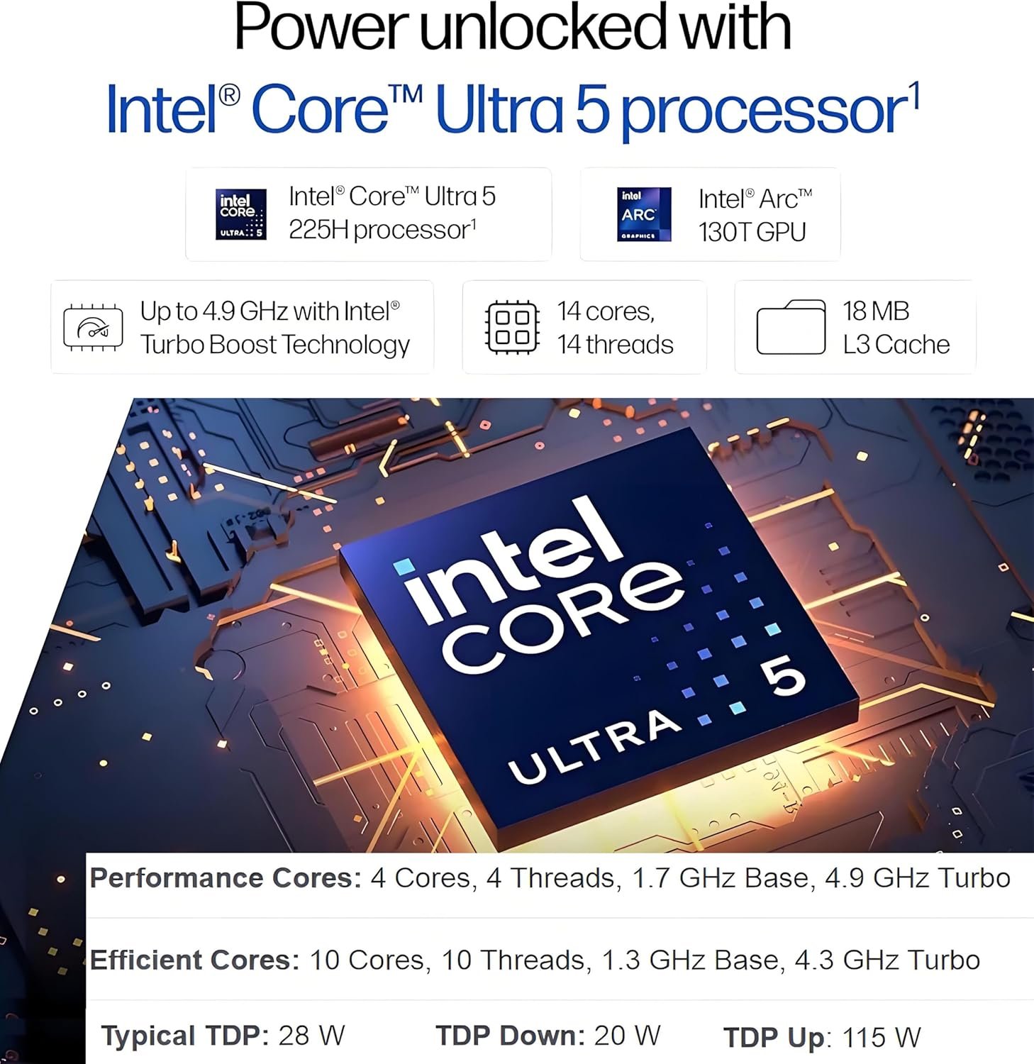 Processor: Intel Core Ultra 5 225H, 14C (4P + 8E + 2LPE) / 14T, Max Turbo up to 4.9GHz, 18MBNPU: Integrated Intel AI Boost, up to 13 TOPS