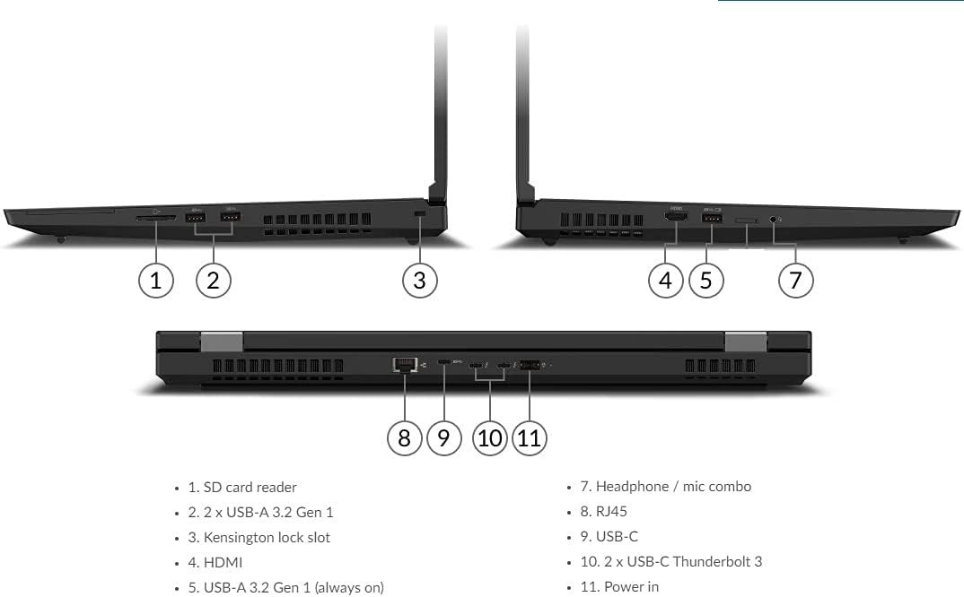 Display 17.3″ FHD (1920 x 1080) IPS, anti-glare, 300 nits Processor 10th Generation Intel Core i7-10750H Processor (2.60 GHz, up to 5.00 GHz with Turbo Boost, 6 Cores, 12 Threads, 12 MB Cache) Graphics Nvidia Quadro T2000 4GB Storage 2TB PCIe NVMe M.2 SSD Memory 64GB DDR4 RAM Networking Intel AX201 Wi-Fi 6 802.11ax 2×2; Bluetooth 5.1 Operating System Windows 10 Professional 64-bit for Workstation Battery Up to 14 hours (MM14); Up to 9 hours (MM18); Camera HD 720p Webcam with ThinkShutter Keyboard Spill-resistant; Backlit; English; No Numeric keypad Security Fingerprint reader; TPM 2.0 Dimensions 1.31″ x 16.38″ x 11.06″ Weight 7.1 lbs What’s in the box? 1 x ThinkPad P17; 1 x Power supply; Documents