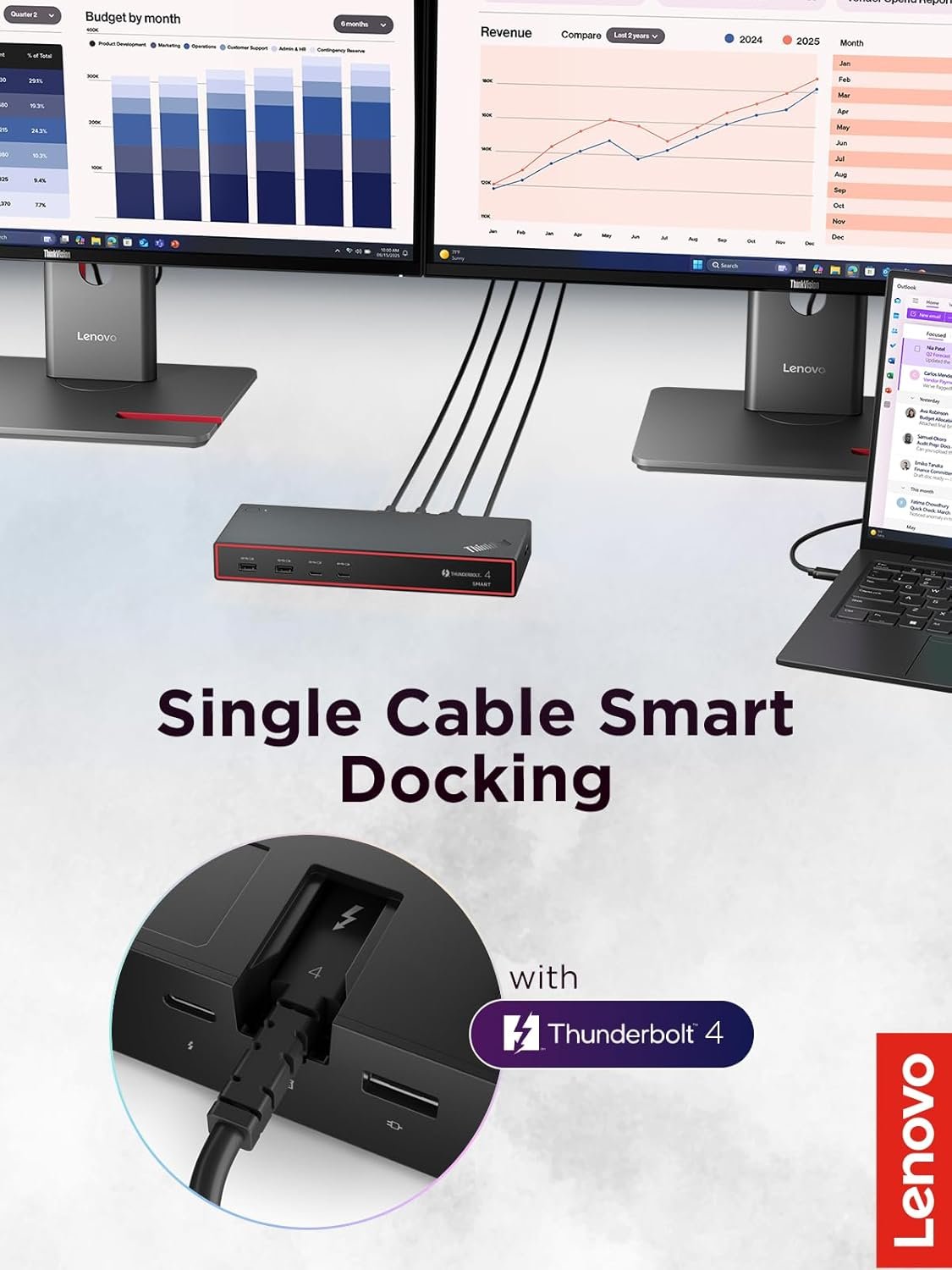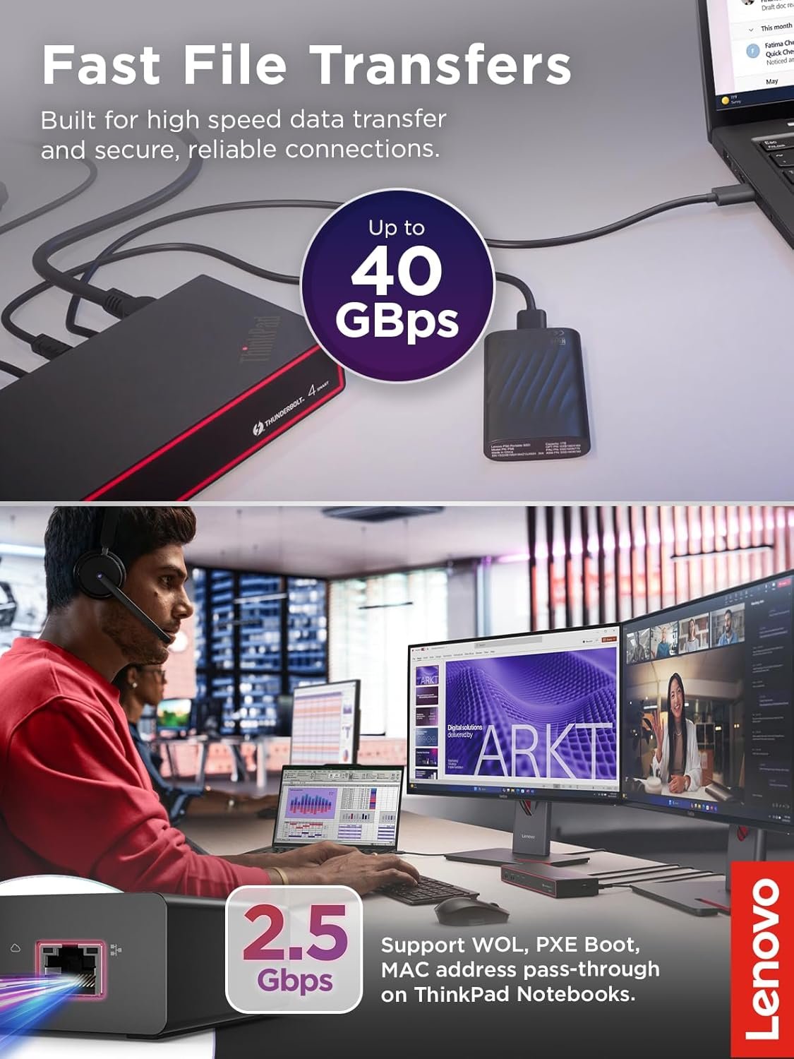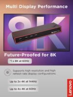 THUNDERBOLT 4 CONNECTIVITY: ThinkPad Thunderbolt 4 Smart Dock delivers up to 40 Gbps bandwidth, supporting one 8K 60Hz display or two 4K 144Hz monitors to transform your laptop into a powerful workstation.