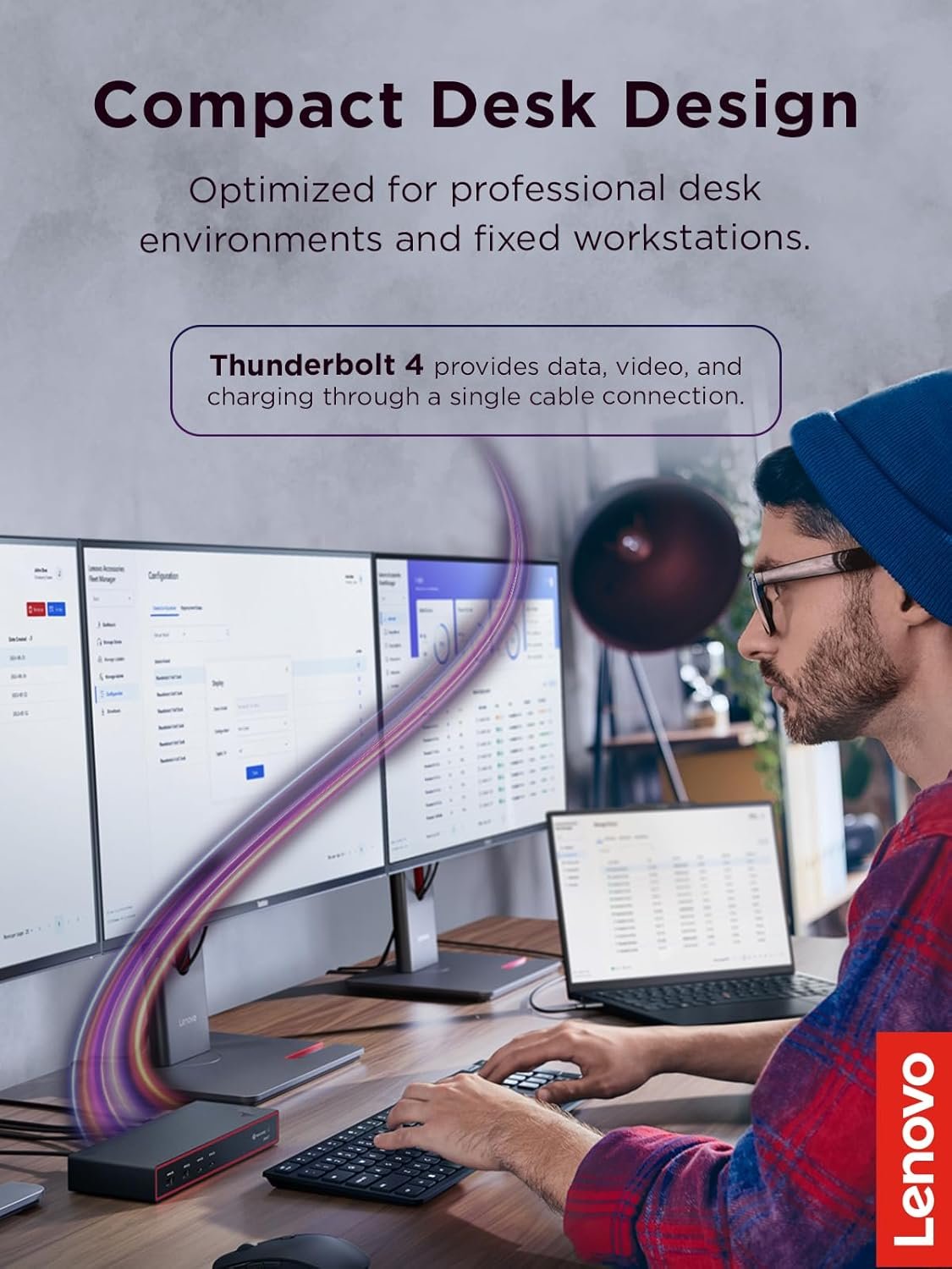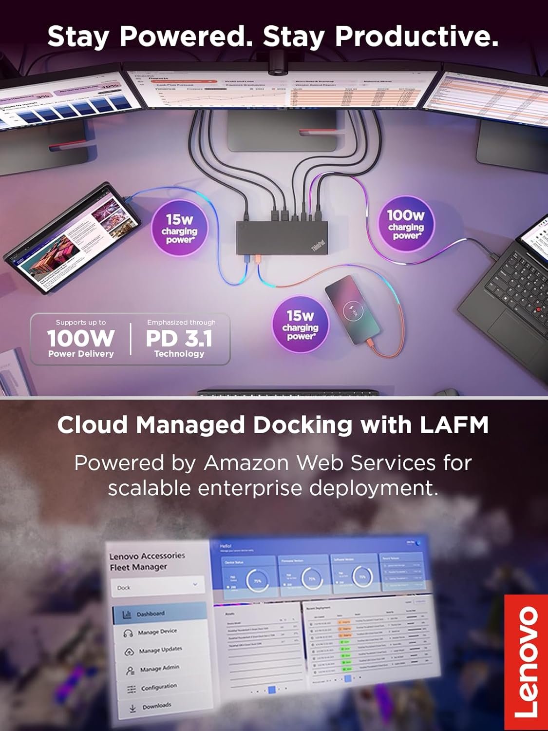 INTELLIGENT MANAGEMENT: Lenovo Accessories Fleet Manager (LAFM) provides cloud-based management through a web browser, allowing IT managers to update, configure, and diagnose dock fleets remotely.