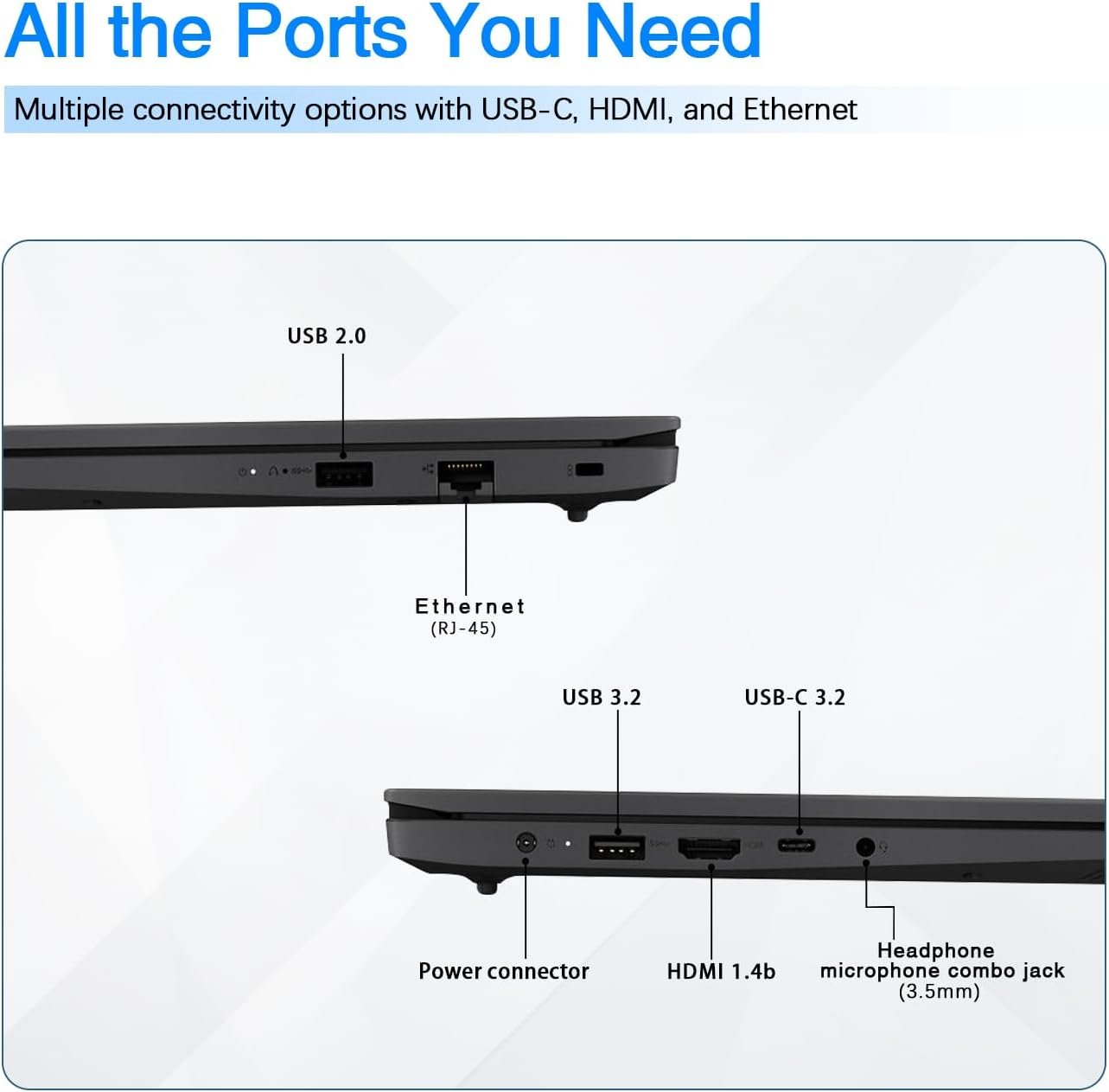 Processor: Intel Celeron N5100 (4C / 4T, 1.1 / 2.8GHz, 4MB L3) Graphics: Intel UHD Graphics Operating system: Windows 11 Pro 64-bit Memory: 32GB DDR4 SDRAM Hard Drive: 1TB Solid State Drive Optical Drive: No Display: 15.6″ FHD (1920×1080) 250nits Anti-glare Connectivity: Wi-Fi 5, 802.11ac 2×2 + BT5.1 Audio: High Definition (HD) Audio, Realtek ALC3287 codec Spreakers: Stereo speakers, 1.5W x 2, Dolby Audio Keyboard: US English, NonBacklit Full Size Keyboard Built-in HD Webcam: HD 720p with Privacy Shutter Ports: 1 x USB 2.0 2 x USB 3.2 Gen 1 1 x AC smart pin 1 x HDMI 1.4b 1 x Headphone / Mic Combo Jack 1 x Ethernet Port (RJ-45) Battery:: Up to 11.5 Hours Color: Black Dimensions L x W x H (inches): 14.14 x 9.28 x 0.78 Weight: 3.75 lbs