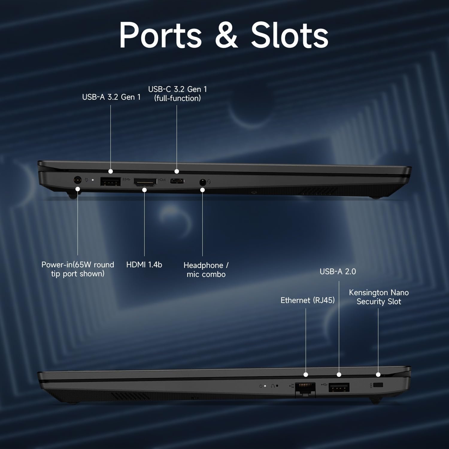 Enhanced Connectivity and Versatility: 1 x USB-C 3.2 Gen 1, 1 x USB-A 3.2 Gen 1, 1 x USB-A 2.0, 1 x HDMI, 1 x Ethernet (RJ45), 1 x Headphone / mic combo, Webcam, Wi-Fi