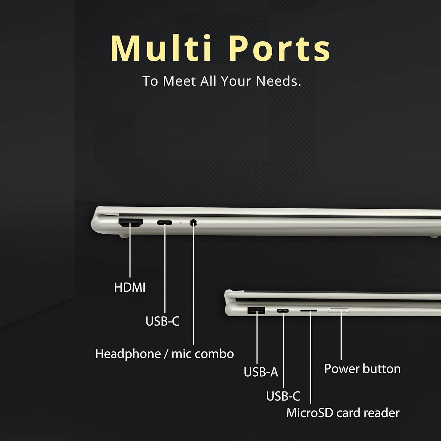 【Windows 11】12.48 x 8.98 x 0.61 inches, 3.09 lbs.【Ports】1 x USB-A, 2 x USB-C, 1 x HDMI 2.1, 1x Headphone/ mic combo jack (3.5mm), 1x microSD card reader. 5MP IR Camera. Wi-Fi 7+ BT5.4. 【Bonus Docking Station Set】1x 7-in-1 Docking Station with 128GB Storage, 1x 32GB MicroSD Card with Adapter, 1x Type-C Data Cable, 1x 3-in-1 Charging Cable, 1x Suede Cleaning Cloth.