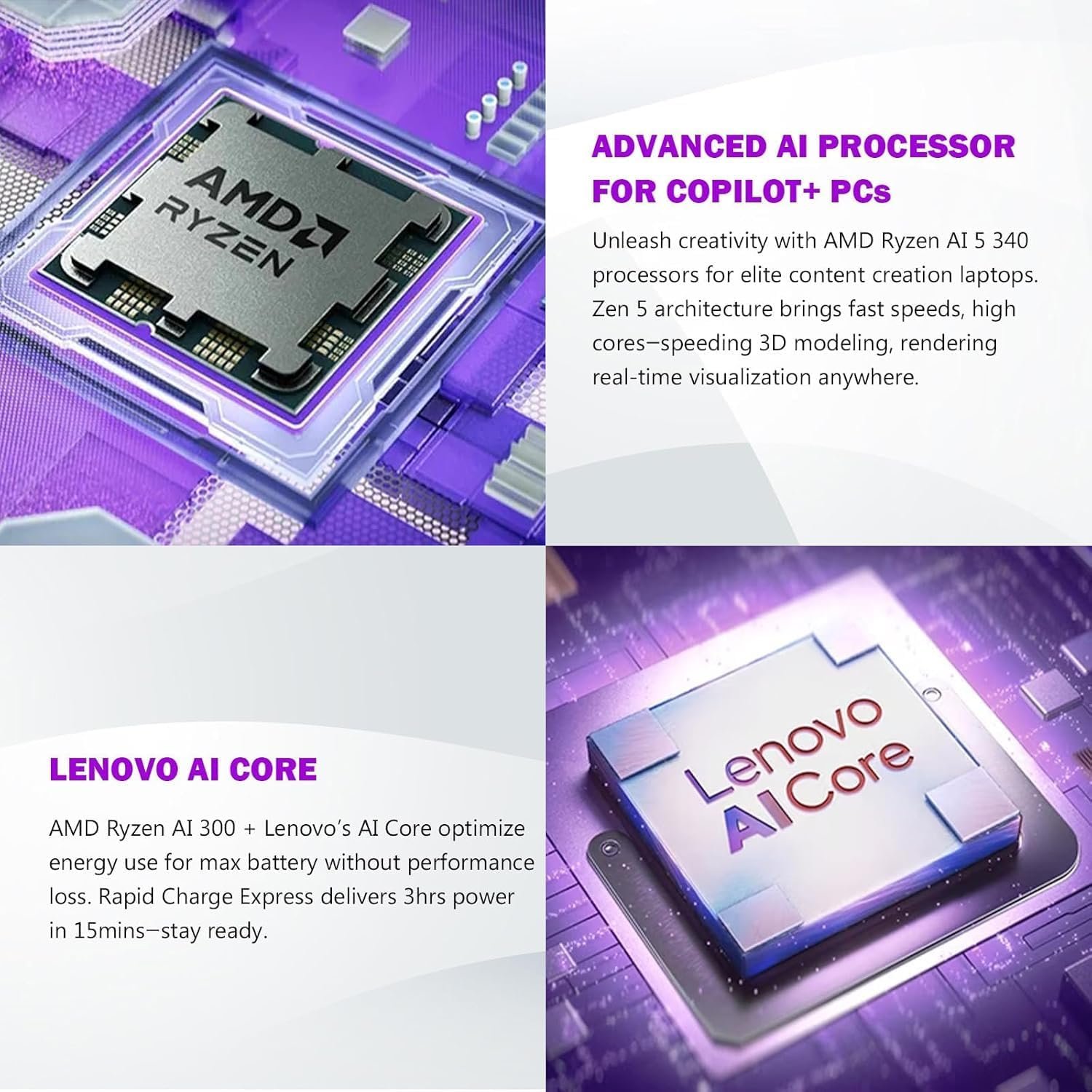 Stay powered for the long haul with AMD Ryzen AI 5 340 processors and Lenovo’s AI Core, designed to optimize energy use based on what you’re doing. Push battery life to the max without losing performance. And when you need a quick boost, Rapid Charge Express delivers 3 hours of power in just 15 minutes, so you’re always ready to keep going.